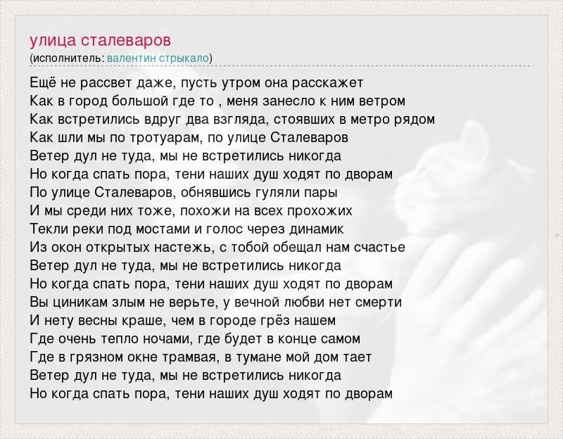 Ещё не рассвет даже, пусть утром она расскажет Как в город большой где то , меня занесло к ним ветром Как встретились вдруг два взгляда, стоявших в метро рядом Как шли мы по тротуарам, по улице Сталеваров Ветер дул не туда, мы не встретились никогда Но когда спать пора, тени наших душ ходят по дворам По улице Сталеваров, обнявшись гуляли пары И мы среди них тоже, похожи на всех прохожих Текли реки под мостами и голос через динамик Из окон открытых настежь, с тобой обещал нам счастье Ветер дул не туда, мы не встретились никогда Но когда спать пора, тени наших душ ходят по дворам Вы циникам злым не верьте, у вечной любви нет смерти И нету весны краше, чем в городе грёз нашем Где очень тепло ночами, где будет в конце самом Где в грязном окне трамвая, в тумане мой дом тает Ветер дул не туда, мы не встретились никогда Но когда спать пора, тени наших душ ходят по дворам