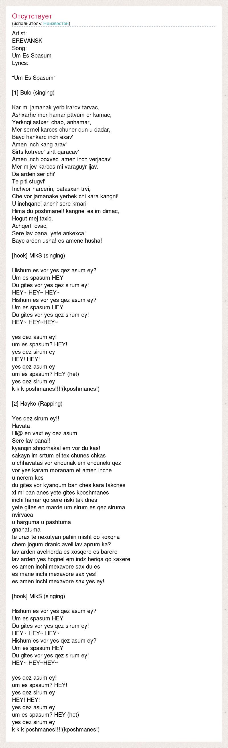 Artist: EREVANSKI Song: Um Es Spasum Lyrics: "Um Es Spasum" [1] Bulo (singing) Kar mi jamanak yerb irarov tarvac, Ashxarhe mer hamar pttvum er kamac, Yerknqi astxeri chap, anhamar, Mer sernel karces chuner qun u dadar, Bayc hankarc inch exav' Amen inch kang arav' Sirts kotrvec' sirtt qaracav' Amen inch poxvec' amen inch verjacav' Mer mijev karces mi varaguyr ijav. Da arden ser chi' Te piti stugvi' Inchvor harcerin, patasxan trvi, Che vor jamanake yerbek chi kara kangni! U inchqanel ancni' sere kmari' Hima du poshmanel! kangnel es im dimac, Hogut mej taxic, Achqert lcvac, Sere lav bana, yete ankexca! Bayc arden usha! es amene husha! [hook] MikS (singing) Hishum es vor yes qez asum ey? Um es spasum HEY Du gites vor yes qez sirum ey! HEY~ HEY~ HEY~ Hishum es vor yes qez asum ey? Um es spasum HEY Du gites vor yes qez sirum ey! HEY~ HEY~HEY~ yes qez asum ey! um es spasum? HEY! yes qez sirum ey HEY! HEY! yes qez asum ey um es spasum? HEY (het) yes qez sirum ey k k k poshmanes!!!!(kposhmanes!) [2] Hayko (Rapping) Yes qez sirum ey!! Havata Hl@ en vaxt ey qez asum Sere lav bana!! kyanqin shnorhakal em vor du kas! sakayn im srtum el tex chunes chkas u chhavatas vor endunak em endunelu qez vor yes karam moranam et amen inche u nerem kes du gites vor kyanqum ban ches kara takcnes xi mi ban anes yete gites kposhmanes inchi hamar qo sere riski tak dnes yete gites en marde um sirum es qez siruma nvirvaca u harguma u pashtuma gnahatuma te urax te nexutyan pahin misht qo koxqna chem jogum dranic aveli lav aprum ka? lav arden avelnorda es xosqere es barere lav arden yes hognel em indz heriqa qo xaxere es amen inchi mexavore sax du es es mane inchi mexavore sax yes! es amen inchi mexavore sax yes ey! [hook] MikS (singing) Hishum es vor yes qez asum ey? Um es spasum HEY Du gites vor yes qez sirum ey! HEY~ HEY~ HEY~ Hishum es vor yes qez asum ey? Um es spasum HEY Du gites vor yes qez sirum ey! HEY~ HEY~HEY~ yes qez asum ey! um es spasum? HEY! yes qez sirum ey HEY! HEY! yes qez asum ey um es spasum? HEY (het) yes qez sirum ey k k k poshmanes!!!!(kposhmanes!)