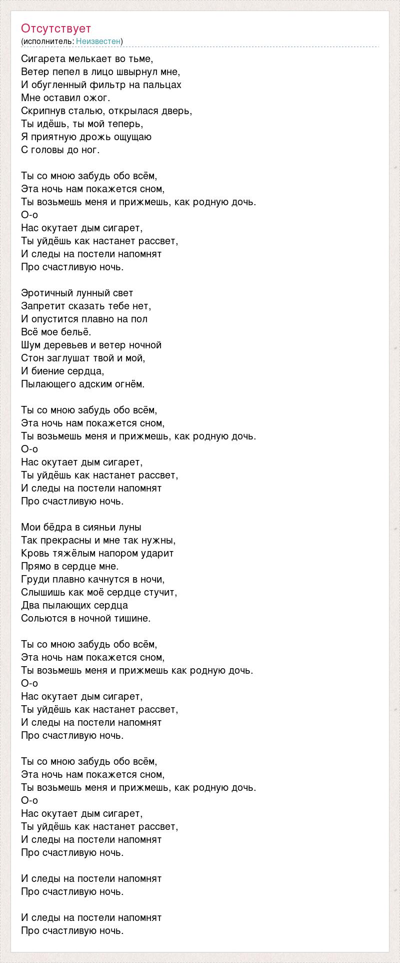 Сигарета мелькает во тьме, Ветер пепел в лицо швырнул мне, И обугленный фильтр на пальцах Мне оставил ожог. Скрипнув сталью, открылася дверь, Ты идёшь, ты мой теперь, Я приятную дрожь ощущаю С головы до ног. Ты со мною забудь обо всём, Эта ночь нам покажется сном, Ты возьмешь меня и прижмешь, как родную дочь. О-о Нас окутает дым сигарет, Ты уйдёшь как настанет рассвет, И следы на постели напомнят Про счастливую ночь. Эротичный лунный свет Запретит сказать тебе нет, И опустится плавно на пол Всё мое бельё. Шум деревьев и ветер ночной Стон заглушат твой и мой, И биение сердца, Пылающего адским огнём. Ты со мною забудь обо всём, Эта ночь нам покажется сном, Ты возьмешь меня и прижмешь, как родную дочь. О-о Нас окутает дым сигарет, Ты уйдёшь как настанет рассвет, И следы на постели напомнят Про счастливую ночь. Мои бёдра в сияньи луны Так прекрасны и мне так нужны, Кровь тяжёлым напором ударит Прямо в сердце мне. Груди плавно качнутся в ночи, Слышишь как моё сердце стучит, Два пылающих сердца Сольются в ночной тишине. Ты со мною забудь обо всём, Эта ночь нам покажется сном, Ты возьмешь меня и прижмешь как родную дочь. О-о Нас окутает дым сигарет, Ты уйдёшь как настанет рассвет, И следы на постели напомнят Про счастливую ночь. Ты со мною забудь обо всём, Эта ночь нам покажется сном, Ты возьмешь меня и прижмешь, как родную дочь. О-о Нас окутает дым сигарет, Ты уйдёшь как настанет рассвет, И следы на постели напомнят Про счастливую ночь. И следы на постели напомнят Про счастливую ночь. И следы на постели напомнят Про счастливую ночь.