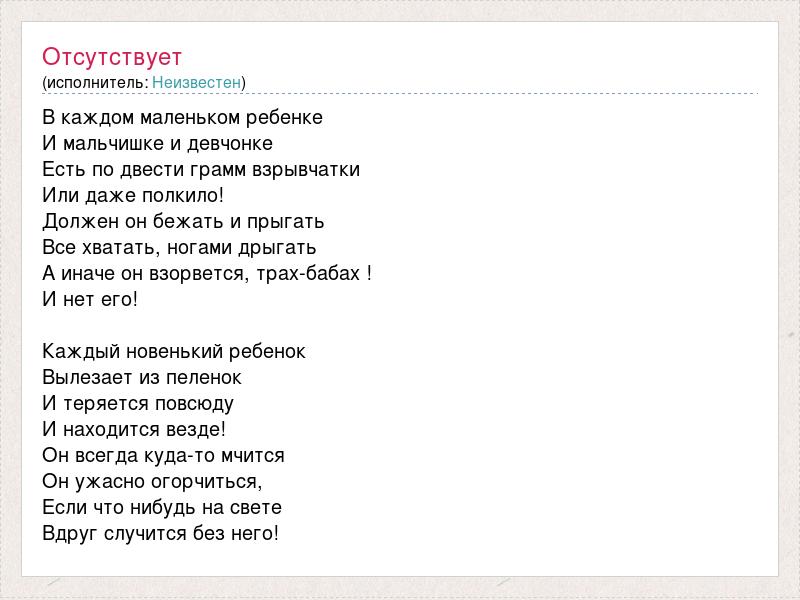 В каждом маленьком ребенке И мальчишке и девчонке Есть по двести грамм взрывчатки Или даже полкило! Должен он бежать и прыгать Все хватать, ногами дрыгать А иначе он взорвется, трах-бабах ! И нет его! Каждый новенький ребенок Вылезает из пеленок И теряется повсюду И находится везде! Он всегда куда-то мчится Он ужасно огорчиться, Если что нибудь на свете Вдруг случится без него!