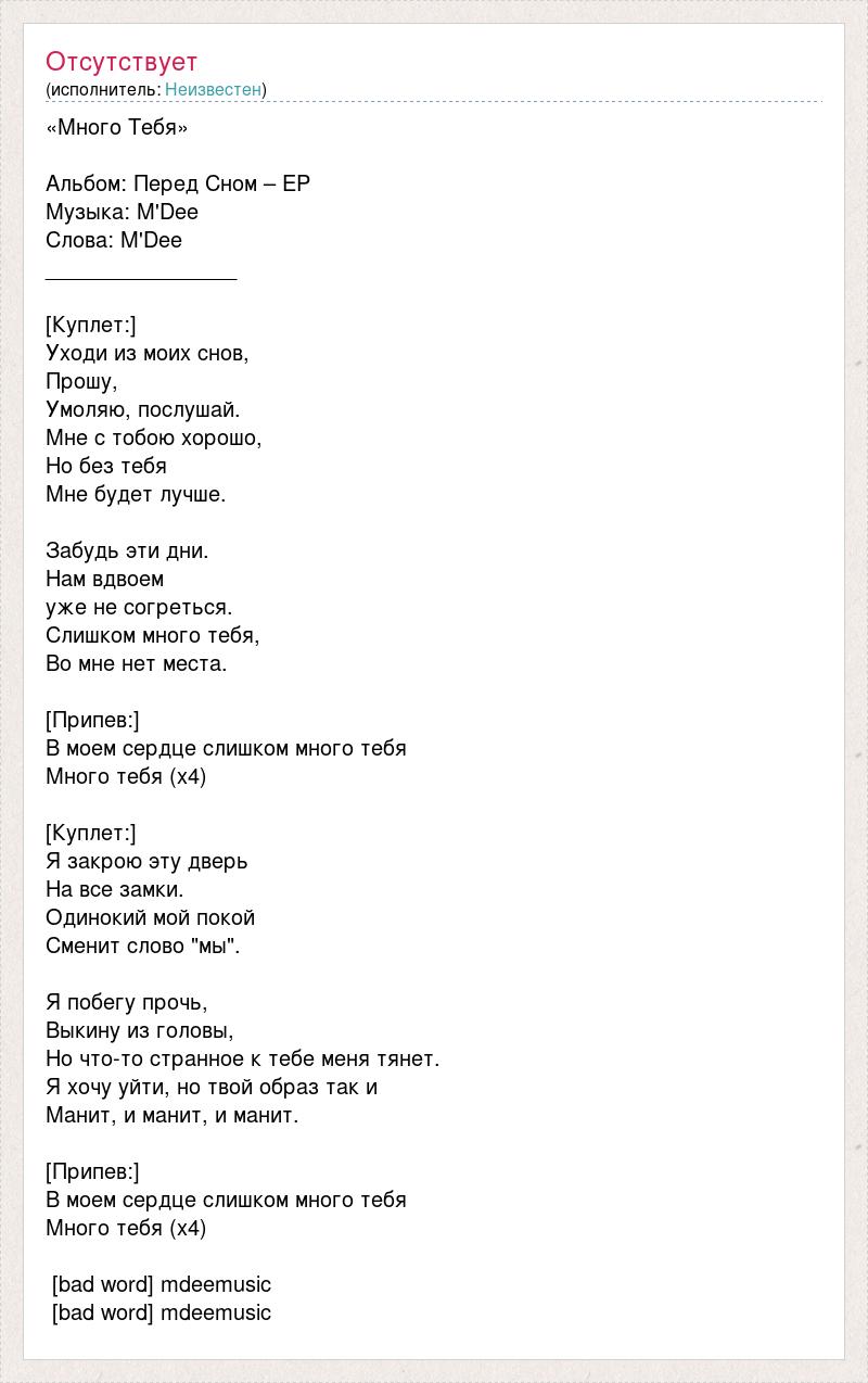 «Много Тебя» Альбом: Перед Сном – EP Музыка: M'Dee Слова: M'Dee ________________ [Куплет:] Уходи из моих снов, Прошу, Умоляю, послушай. Мне с тобою хорошо, Но без тебя Мне будет лучше. Забудь эти дни. Нам вдвоем уже не согреться. Слишком много тебя, Во мне нет места. [Припев:] В моем сердце слишком много тебя Много тебя (х4) [Куплет:] Я закрою эту дверь На все замки. Одинокий мой покой Сменит слово "мы". Я побегу прочь, Выкину из головы, Но что-то странное к тебе меня тянет. Я хочу уйти, но твой образ так и Манит, и манит, и манит. [Припев:] В моем сердце слишком много тебя Много тебя (х4) [bad word] mdeemusic [bad word] mdeemusic