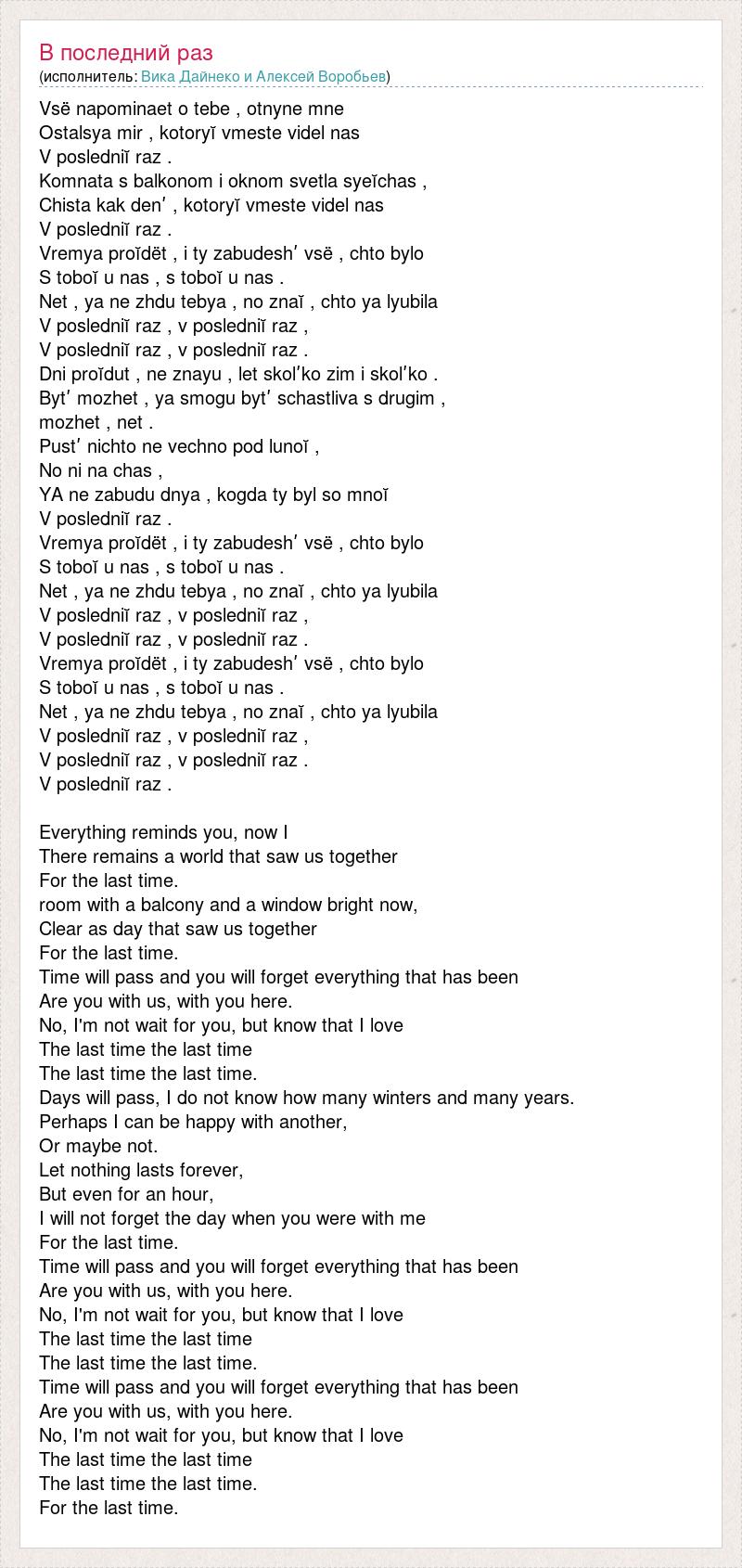 Vsë napominaet o tebe , otnyne mne Ostalsya mir , kotoryĭ vmeste videl nas V posledniĭ raz . Komnata s balkonom i oknom svetla syeĭchas , Chista kak denʹ , kotoryĭ vmeste videl nas V posledniĭ raz . Vremya proĭdët , i ty zabudeshʹ vsë , chto bylo S toboĭ u nas , s toboĭ u nas . Net , ya ne zhdu tebya , no znaĭ , chto ya lyubila V posledniĭ raz , v posledniĭ raz , V posledniĭ raz , v posledniĭ raz . Dni proĭdut , ne znayu , let skolʹko zim i skolʹko . Bytʹ mozhet , ya smogu bytʹ schastliva s drugim , mozhet , net . Pustʹ nichto ne vechno pod lunoĭ , No ni na chas , YA ne zabudu dnya , kogda ty byl so mnoĭ V posledniĭ raz . Vremya proĭdët , i ty zabudeshʹ vsë , chto bylo S toboĭ u nas , s toboĭ u nas . Net , ya ne zhdu tebya , no znaĭ , chto ya lyubila V posledniĭ raz , v posledniĭ raz , V posledniĭ raz , v posledniĭ raz . Vremya proĭdët , i ty zabudeshʹ vsë , chto bylo S toboĭ u nas , s toboĭ u nas . Net , ya ne zhdu tebya , no znaĭ , chto ya lyubila V posledniĭ raz , v posledniĭ raz , V posledniĭ raz , v posledniĭ raz . V posledniĭ raz . Everything reminds you, now I There remains a world that saw us together For the last time. room with a balcony and a window bright now, Clear as day that saw us together For the last time. Time will pass and you will forget everything that has been Are you with us, with you here. No, I'm not wait for you, but know that I love The last time the last time The last time the last time. Days will pass, I do not know how many winters and many years. Perhaps I can be happy with another, Or maybe not. Let nothing lasts forever, But even for an hour, I will not forget the day when you were with me For the last time. Time will pass and you will forget everything that has been Are you with us, with you here. No, I'm not wait for you, but know that I love The last time the last time The last time the last time. Time will pass and you will forget everything that has been Are you with us, with you here. No, I'm not wait for you, but know that I love The last time the last time The last time the last time. For the last time.
