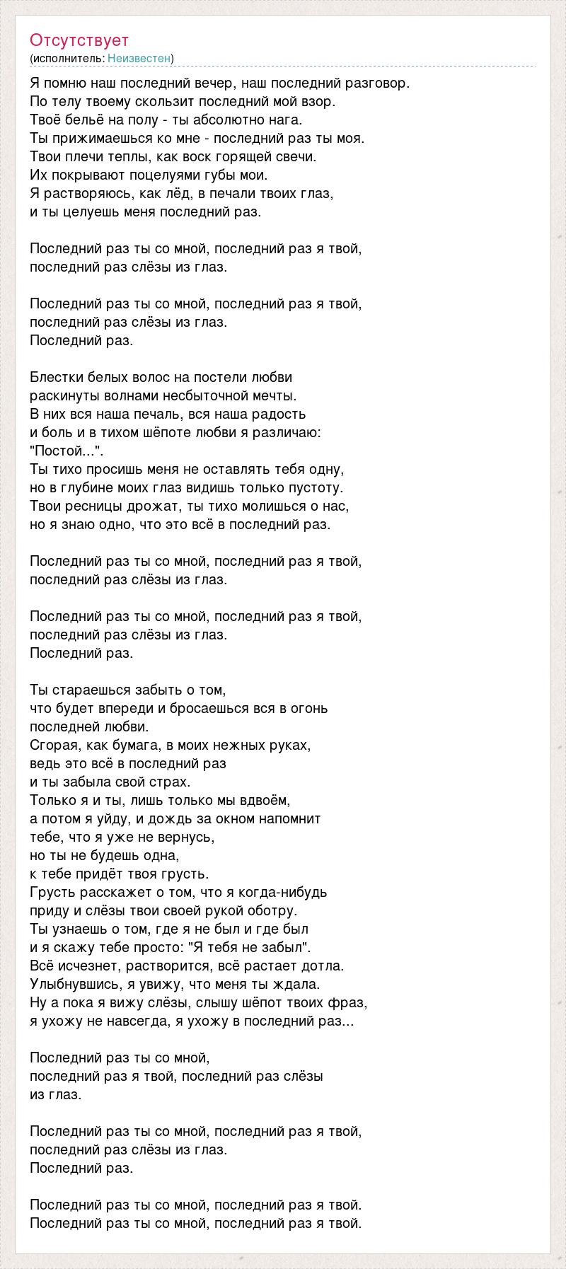 Я помню наш последний вечер, наш последний разговор. По телу твоему скользит последний мой взор. Твоё бельё на полу - ты абсолютно нага. Ты прижимаешься ко мне - последний раз ты моя. Твои плечи теплы, как воск горящей свечи. Их покрывают поцелуями губы мои. Я растворяюсь, как лёд, в печали твоих глаз, и ты целуешь меня последний раз. Последний раз ты со мной, последний раз я твой, последний раз слёзы из глаз. Последний раз ты со мной, последний раз я твой, последний раз слёзы из глаз. Последний раз. Блестки белых волос на постели любви раскинуты волнами несбыточной мечты. В них вся наша печаль, вся наша радость и боль и в тихом шёпоте любви я различаю: "Постой...". Ты тихо просишь меня не оставлять тебя одну, но в глубине моих глаз видишь только пустоту. Твои ресницы дрожат, ты тихо молишься о нас, но я знаю одно, что это всё в последний раз. Последний раз ты со мной, последний раз я твой, последний раз слёзы из глаз. Последний раз ты со мной, последний раз я твой, последний раз слёзы из глаз. Последний раз. Ты стараешься забыть о том, что будет впереди и бросаешься вся в огонь последней любви. Сгорая, как бумага, в моих нежных руках, ведь это всё в последний раз и ты забыла свой страх. Только я и ты, лишь только мы вдвоём, а потом я уйду, и дождь за окном напомнит тебе, что я уже не вернусь, но ты не будешь одна, к тебе придёт твоя грусть. Грусть расскажет о том, что я когда-нибудь приду и слёзы твои своей рукой оботру. Ты узнаешь о том, где я не был и где был и я скажу тебе просто: "Я тебя не забыл". Всё исчезнет, растворится, всё растает дотла. Улыбнувшись, я увижу, что меня ты ждала. Ну а пока я вижу слёзы, слышу шёпот твоих фраз, я ухожу не навсегда, я ухожу в последний раз... Последний раз ты со мной, последний раз я твой, последний раз слёзы из глаз. Последний раз ты со мной, последний раз я твой, последний раз слёзы из глаз. Последний раз. Последний раз ты со мной, последний раз я твой. Последний раз ты со мной, последний раз я твой.