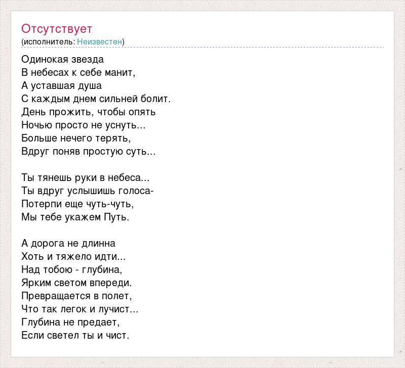 Одинокая звезда В небесах к себе манит, А уставшая душа С каждым днем сильней болит. День прожить, чтобы опять Ночью просто не уснуть... Больше нечего терять, Вдруг поняв простую суть... Ты тянешь руки в небеса... Ты вдруг услышишь голоса- Потерпи еще чуть-чуть, Мы тебе укажем Путь. А дорога не длинна Хоть и тяжело идти... Над тобою - глубина, Ярким светом впереди. Превращается в полет, Что так легок и лучист... Глубина не предает, Если светел ты и чист.