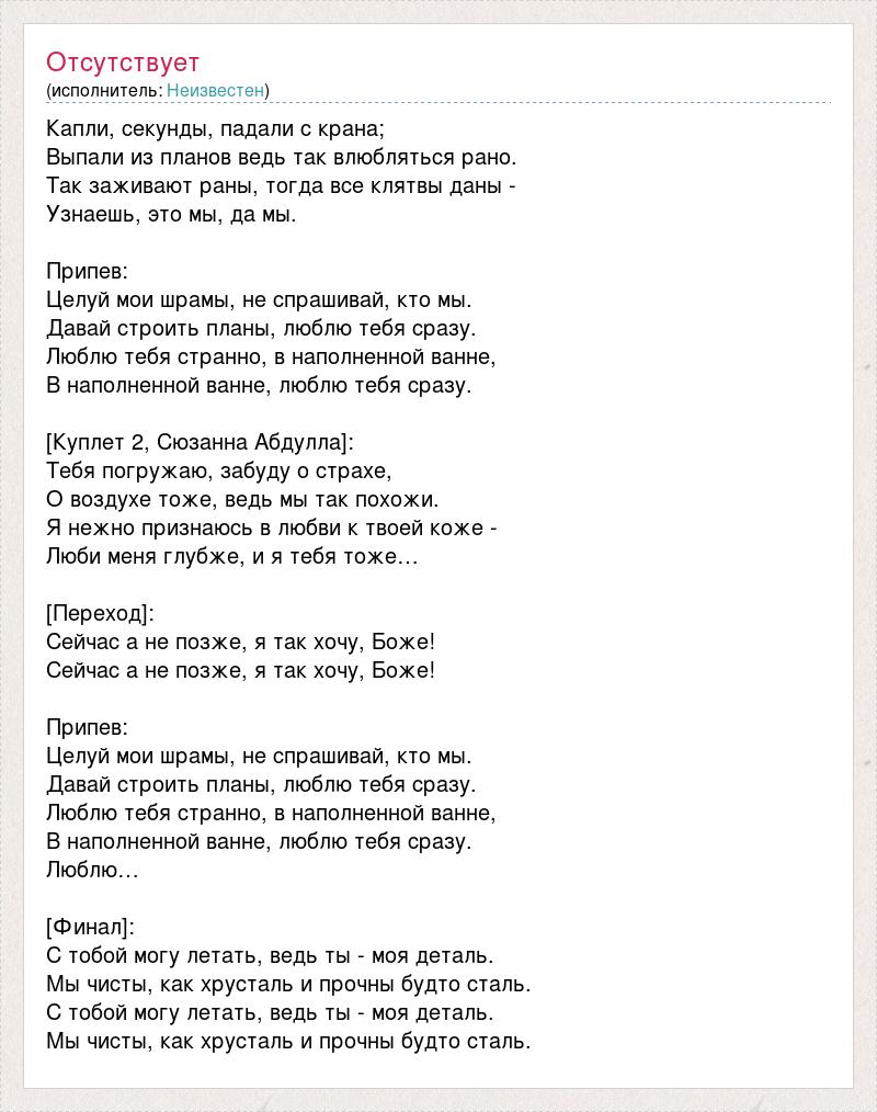 Капли, секунды, падали с крана; Выпали из планов ведь так влюбляться рано. Так заживают раны, тогда все клятвы даны - Узнаешь, это мы, да мы. Припев: Целуй мои шрамы, не спрашивай, кто мы. Давай строить планы, люблю тебя сразу. Люблю тебя странно, в наполненной ванне, В наполненной ванне, люблю тебя сразу. [Куплет 2, Сюзанна Абдулла]: Тебя погружаю, забуду о страхе, О воздухе тоже, ведь мы так похожи. Я нежно признаюсь в любви к твоей коже - Люби меня глубже, и я тебя тоже… [Переход]: Сейчас а не позже, я так хочу, Боже! Сейчас а не позже, я так хочу, Боже! Припев: Целуй мои шрамы, не спрашивай, кто мы. Давай строить планы, люблю тебя сразу. Люблю тебя странно, в наполненной ванне, В наполненной ванне, люблю тебя сразу. Люблю… [Финал]: С тобой могу летать, ведь ты - моя деталь. Мы чисты, как хрусталь и прочны будто сталь. С тобой могу летать, ведь ты - моя деталь. Мы чисты, как хрусталь и прочны будто сталь.