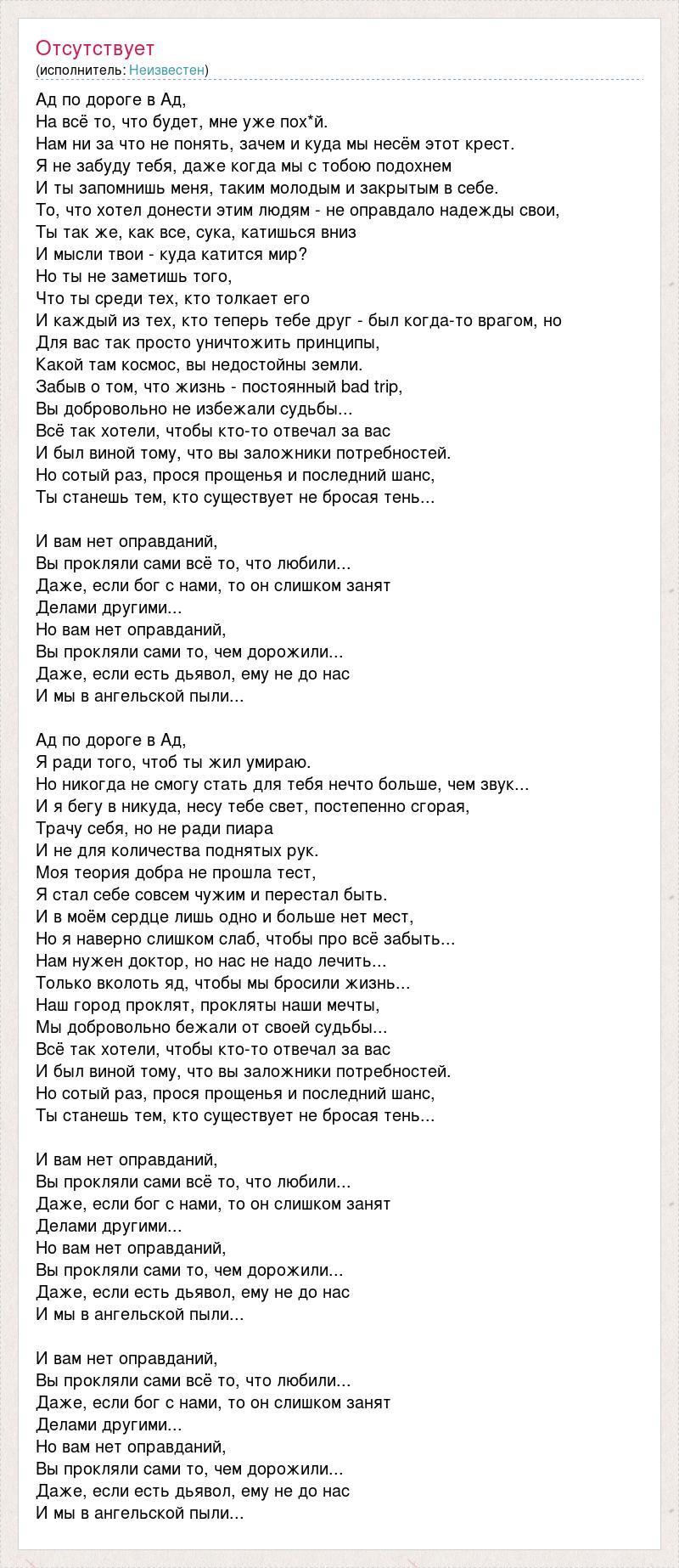 Ад по дороге в Ад, На всё то, что будет, мне уже пох*й. Нам ни за что не понять, зачем и куда мы несём этот крест. Я не забуду тебя, даже когда мы с тобою подохнем И ты запомнишь меня, таким молодым и закрытым в себе. То, что хотел донести этим людям - не оправдало надежды свои, Ты так же, как все, сука, катишься вниз И мысли твои - куда катится мир? Но ты не заметишь того, Что ты среди тех, кто толкает его И каждый из тех, кто теперь тебе друг - был когда-то врагом, но Для вас так просто уничтожить принципы, Какой там космос, вы недостойны земли. Забыв о том, что жизнь - постоянный bad trip, Вы добровольно не избежали судьбы... Всё так хотели, чтобы кто-то отвечал за вас И был виной тому, что вы заложники потребностей. Но сотый раз, прося прощенья и последний шанс, Ты станешь тем, кто существует не бросая тень... И вам нет оправданий, Вы прокляли сами всё то, что любили... Даже, если бог с нами, то он слишком занят Делами другими... Но вам нет оправданий, Вы прокляли сами то, чем дорожили... Даже, если есть дьявол, ему не до нас И мы в ангельской пыли... Ад по дороге в Ад, Я ради того, чтоб ты жил умираю. Но никогда не смогу стать для тебя нечто больше, чем звук... И я бегу в никуда, несу тебе свет, постепенно сгорая, Трачу себя, но не ради пиара И не для количества поднятых рук. Моя теория добра не прошла тест, Я стал себе совсем чужим и перестал быть. И в моём сердце лишь одно и больше нет мест, Но я наверно слишком слаб, чтобы про всё забыть... Нам нужен доктор, но нас не надо лечить... Только вколоть яд, чтобы мы бросили жизнь... Наш город проклят, прокляты наши мечты, Мы добровольно бежали от своей судьбы... Всё так хотели, чтобы кто-то отвечал за вас И был виной тому, что вы заложники потребностей. Но сотый раз, прося прощенья и последний шанс, Ты станешь тем, кто существует не бросая тень... И вам нет оправданий, Вы прокляли сами всё то, что любили... Даже, если бог с нами, то он слишком занят Делами другими... Но вам нет оправданий, Вы прокляли сами то, чем дорожили... Даже, если есть дьявол, ему не до нас И мы в ангельской пыли... И вам нет оправданий, Вы прокляли сами всё то, что любили... Даже, если бог с нами, то он слишком занят Делами другими... Но вам нет оправданий, Вы прокляли сами то, чем дорожили... Даже, если есть дьявол, ему не до нас И мы в ангельской пыли...