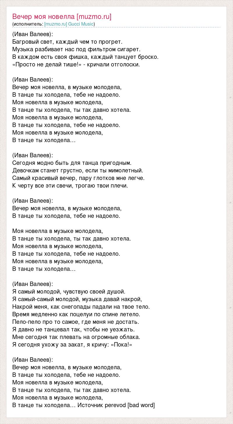 (Иван Валеев): Багровый свет, каждый чем то прогрет. Музыка разбивает нас под фильтром сигарет. В каждом есть своя фишка, каждый танцует броско. «Просто не делай тише!» - кричали отголоски. (Иван Валеев): Вечер моя новелла, в музыке молодела, В танце ты холодела, тебе не надоело. Моя новелла в музыке молодела, В танце ты холодела, ты так давно хотела. Моя новелла в музыке молодела, В танце ты холодела, тебе не надоело. Моя новелла в музыке молодела, В танце ты холодела… (Иван Валеев): Сегодня модно быть для танца пригодным. Девочкам станет грустно, если ты мимолетный. Самый красивый вечер, пару глотков мне легче. К черту все эти свечи, трогаю твои плечи. (Иван Валеев): Вечер моя новелла, в музыке молодела, В танце ты холодела, тебе не надоело. Моя новелла в музыке молодела, В танце ты холодела, ты так давно хотела. Моя новелла в музыке молодела, В танце ты холодела, тебе не надоело. Моя новелла в музыке молодела, В танце ты холодела… (Иван Валеев): Я самый молодой, чувствую своей душой. Я самый-самый молодой, музыка давай накрой, Накрой меня, как снегопады падали на твое тело. Время медленно как поцелуи по спине летело. Пело-пело про то самое, где меня не достать. Я давно не танцевал так, чтобы не уезжать. Мне сегодня так плевать на огромные облака. Я сегодня ухожу за закат, я кричу: «Пока!» (Иван Валеев): Вечер моя новелла, в музыке молодела, В танце ты холодела, тебе не надоело. Моя новелла в музыке молодела, В танце ты холодела, ты так давно хотела. Моя новелла в музыке молодела, В танце ты холодела… Источник perevod [bad word]