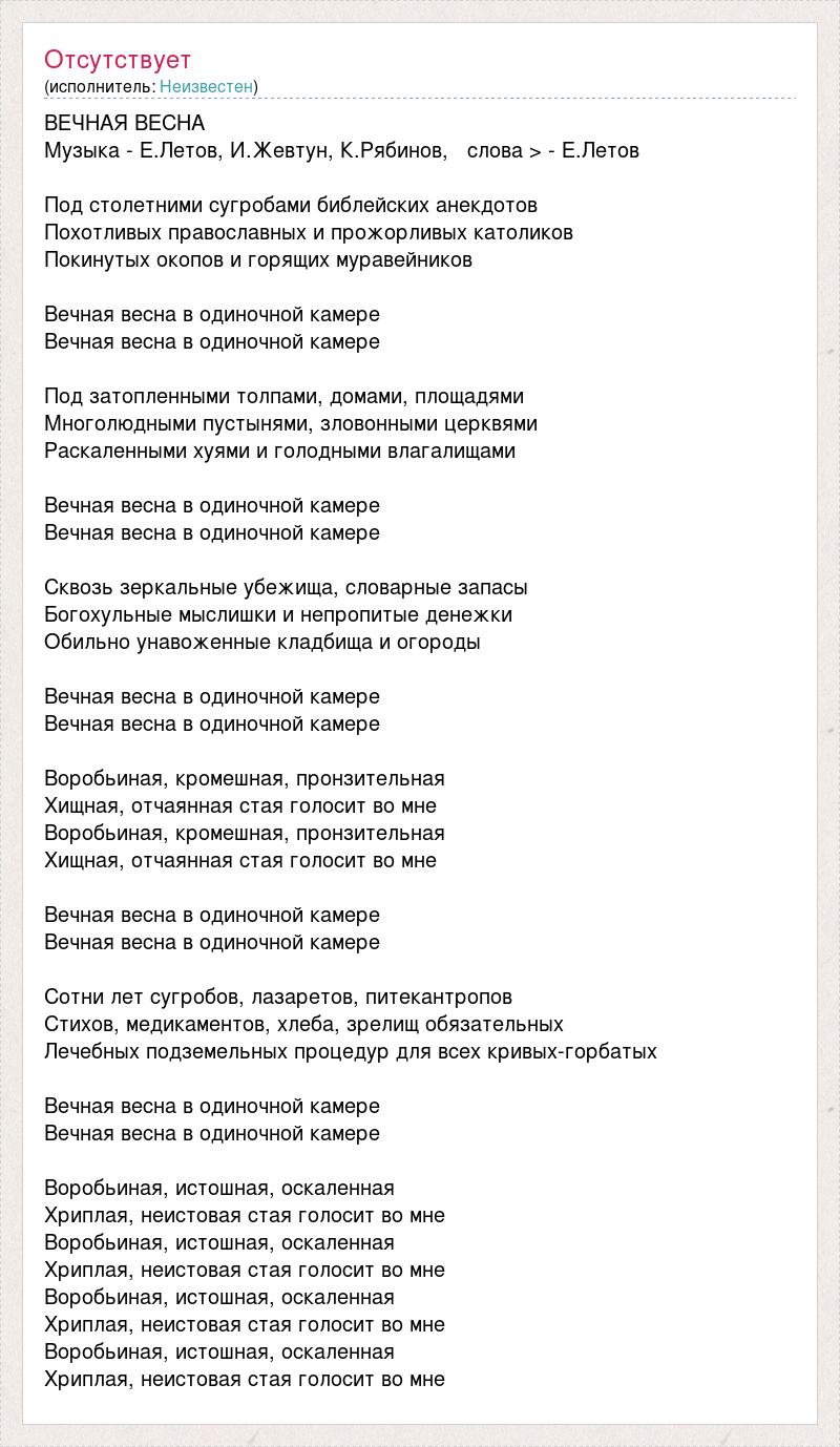 ВЕЧНАЯ ВЕСНА Музыка - Е.Летов, И.Жевтун, К.Рябинов, слова > - Е.Летов Под столетними сугробами библейских анекдотов Похотливых православных и прожорливых католиков Покинутых окопов и горящих муравейников Вечная весна в одиночной камере Вечная весна в одиночной камере Под затопленными толпами, домами, площадями Многолюдными пустынями, зловонными церквями Раскаленными хуями и голодными влагалищами Вечная весна в одиночной камере Вечная весна в одиночной камере Сквозь зеркальные убежища, словарные запасы Богохульные мыслишки и непропитые денежки Обильно унавоженные кладбища и огороды Вечная весна в одиночной камере Вечная весна в одиночной камере Воробьиная, кромешная, пронзительная Хищная, отчаянная стая голосит во мне Воробьиная, кромешная, пронзительная Хищная, отчаянная стая голосит во мне Вечная весна в одиночной камере Вечная весна в одиночной камере Сотни лет сугробов, лазаретов, питекантропов Стихов, медикаментов, хлеба, зрелищ обязательных Лечебных подземельных процедур для всех кривых-горбатых Вечная весна в одиночной камере Вечная весна в одиночной камере Воробьиная, истошная, оскаленная Хриплая, неистовая стая голосит во мне Воробьиная, истошная, оскаленная Хриплая, неистовая стая голосит во мне Воробьиная, истошная, оскаленная Хриплая, неистовая стая голосит во мне Воробьиная, истошная, оскаленная Хриплая, неистовая стая голосит во мне