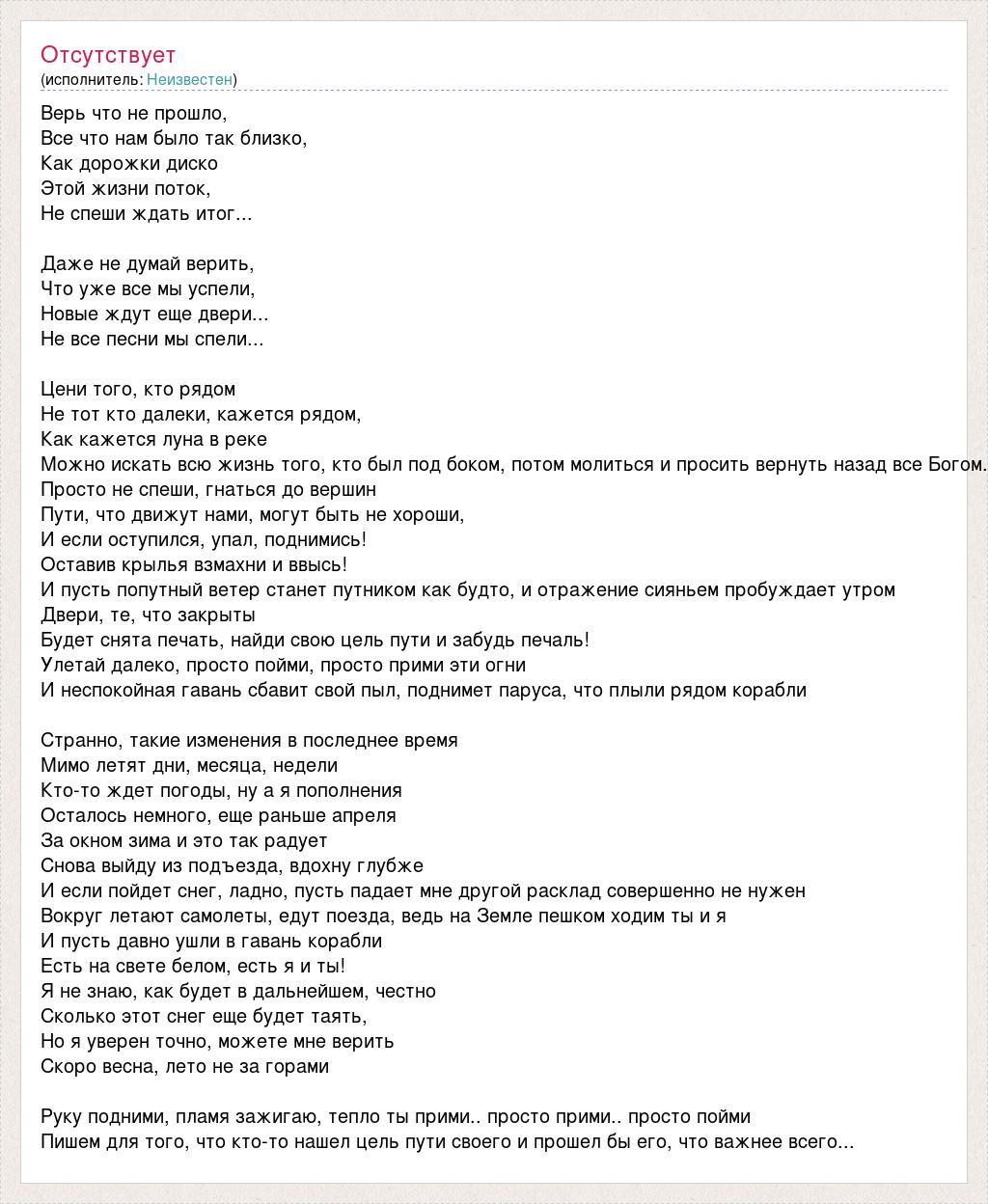 Верь что не прошло, Все что нам было так близко, Как дорожки диско Этой жизни поток, Не спеши ждать итог... Даже не думай верить, Что уже все мы успели, Новые ждут еще двери... Не все песни мы спели... Цени того, кто рядом Не тот кто далеки, кажется рядом, Как кажется луна в реке Можно искать всю жизнь того, кто был под боком, потом молиться и просить вернуть назад все Богом. Просто не спеши, гнаться до вершин Пути, что движут нами, могут быть не хороши, И если оступился, упал, поднимись! Оставив крылья взмахни и ввысь! И пусть попутный ветер станет путником как будто, и отражение сияньем пробуждает утром Двери, те, что закрыты Будет снята печать, найди свою цель пути и забудь печаль! Улетай далеко, просто пойми, просто прими эти огни И неспокойная гавань сбавит свой пыл, поднимет паруса, что плыли рядом корабли Странно, такие изменения в последнее время Мимо летят дни, месяца, недели Кто-то ждет погоды, ну а я пополнения Осталось немного, еще раньше апреля За окном зима и это так радует Снова выйду из подъезда, вдохну глубже И если пойдет снег, ладно, пусть падает мне другой расклад совершенно не нужен Вокруг летают самолеты, едут поезда, ведь на Земле пешком ходим ты и я И пусть давно ушли в гавань корабли Есть на свете белом, есть я и ты! Я не знаю, как будет в дальнейшем, честно Сколько этот снег еще будет таять, Но я уверен точно, можете мне верить Скоро весна, лето не за горами Руку подними, пламя зажигаю, тепло ты прими.. просто прими.. просто пойми Пишем для того, что кто-то нашел цель пути своего и прошел бы его, что важнее всего...