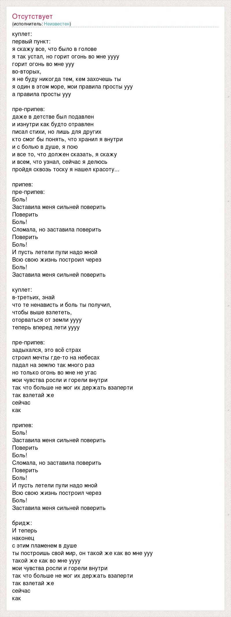 куплет: первый пункт: я скажу все, что было в голове я так устал, но горит огонь во мне уууу горит огонь во мне ууу во-вторых, я не буду никогда тем, кем захочешь ты я один в этом море, мои правила просты ууу а правила просты ууу пре-припев: даже в детстве был подавлен и изнутри как будто отравлен писал стихи, но лишь для других кто смог бы понять, что хранил я внутри и с болью в душе, я пою и все то, что должен сказать, я скажу и всем, что узнал, сейчас я делюсь пройдя сквозь тоску я нашел красоту... припев: пре-припев: Боль! Заставила меня сильней поверить Поверить Боль! Сломала, но заставила поверить Поверить Боль! И пусть летели пули надо мной Всю свою жизнь построил через Боль! Заставила меня сильней поверить куплет: в-третьих, знай что те ненависть и боль ты получил, чтобы выше взлететь, оторваться от земли уууу теперь вперед лети уууу пре-припев: задыхался, это всё страх строил мечты где-то на небесах падал на землю так много раз но только огонь во мне не угас мои чувства росли и горели внутри так что больше не мог их держать взаперти так взлетай же сейчас как припев: Боль! Заставила меня сильней поверить Поверить Боль! Сломала, но заставила поверить Поверить Боль! И пусть летели пули надо мной Всю свою жизнь построил через Боль! Заставила меня сильней поверить бридж: И теперь наконец с этим пламенем в душе ты построишь свой мир, он такой же как во мне ууу такой же как во мне уууу мои чувства росли и горели внутри так что больше не мог их держать взаперти так взлетай же сейчас как
