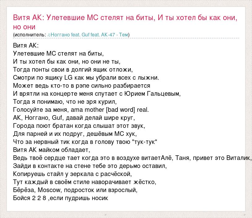 Витя АК: Улетевшие MC стелят на биты, И ты хотел бы как они, но они не ты, Тогда понты свои в долгий ящик отложи, Смотри по ящику LG как мы убрали всех с лыжни. Может ведь кто-то в рэпе сильно разбирается И врятли на концерте меня спутает с Юрием Гальцевым, Тогда я понимаю, что не зря курил, Голосуйте за меня, ama mother [bad word] real. АК, Ноггано, Guf, давай делай шире круг, Города поют братан когда слышат этот звук, Для парней и их подруг, дешёвым MC хук, Что за нервный тик когда в голову твою "тук-тук" Витя АК майком обладает, Ведь твоё сердце тает когда это в воздухе витаетАлё, Таня, привет это Виталик, Зайди в контакте на стене тебе это дерьмо оставил, Копируешь стайл у зеркала с расчёской, Тут каждый в своём стиле наворачивает жёстко, Бёрёза, Moscow, подросток или взрослый, Бойся 2 2 8 ,если пудришь носик