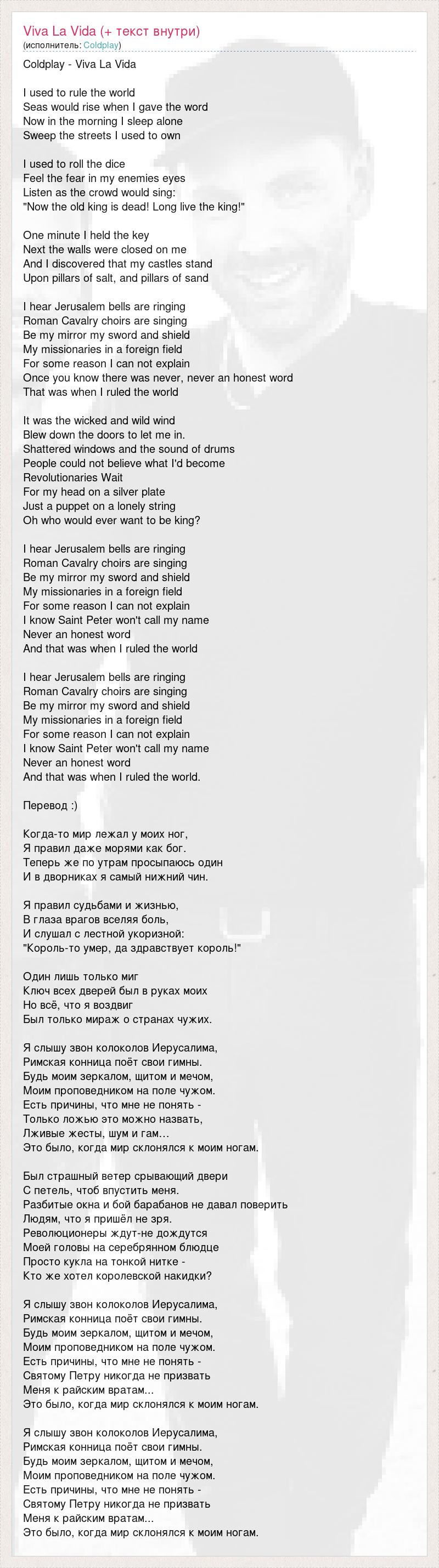 Coldplay - Viva La Vida I used to rule the world Seas would rise when I gave the word Now in the morning I sleep alone Sweep the streets I used to own I used to roll the dice Feel the fear in my enemies eyes Listen as the crowd would sing: "Now the old king is dead! Long live the king!" One minute I held the key Next the walls were closed on me And I discovered that my castles stand Upon pillars of salt, and pillars of sand I hear Jerusalem bells are ringing Roman Cavalry choirs are singing Be my mirror my sword and shield My missionaries in a foreign field For some reason I can not explain Once you know there was never, never an honest word That was when I ruled the world It was the wicked and wild wind Blew down the doors to let me in. Shattered windows and the sound of drums People could not believe what I'd become Revolutionaries Wait For my head on a silver plate Just a puppet on a lonely string Oh who would ever want to be king? I hear Jerusalem bells are ringing Roman Cavalry choirs are singing Be my mirror my sword and shield My missionaries in a foreign field For some reason I can not explain I know Saint Peter won't call my name Never an honest word And that was when I ruled the world I hear Jerusalem bells are ringing Roman Cavalry choirs are singing Be my mirror my sword and shield My missionaries in a foreign field For some reason I can not explain I know Saint Peter won't call my name Never an honest word And that was when I ruled the world. Перевод :) Когда-то мир лежал у моих ног, Я правил даже морями как бог. Теперь же по утрам просыпаюсь один И в дворниках я самый нижний чин. Я правил судьбами и жизнью, В глаза врагов вселяя боль, И слушал с лестной укоризной: "Король-то умер, да здравствует король!" Один лишь только миг Ключ всех дверей был в руках моих Но всё, что я воздвиг Был только мираж о странах чужих. Я слышу звон колоколов Иерусалима, Римская конница поёт свои гимны. Будь моим зеркалом, щитом и мечом, Моим проповедником на поле чужом. Есть причины, что мне не понять - Только ложью это можно назвать, Лживые жесты, шум и гам… Это было, когда мир склонялся к моим ногам. Был страшный ветер срывающий двери С петель, чтоб впустить меня. Разбитые окна и бой барабанов не давал поверить Людям, что я пришёл не зря. Революционеры ждут-не дождутся Моей головы на серебрянном блюдце Просто кукла на тонкой нитке - Кто же хотел королевской накидки? Я слышу звон колоколов Иерусалима, Римская конница поёт свои гимны. Будь моим зеркалом, щитом и мечом, Моим проповедником на поле чужом. Есть причины, что мне не понять - Святому Петру никогда не призвать Меня к райским вратам... Это было, когда мир склонялся к моим ногам. Я слышу звон колоколов Иерусалима, Римская конница поёт свои гимны. Будь моим зеркалом, щитом и мечом, Моим проповедником на поле чужом. Есть причины, что мне не понять - Святому Петру никогда не призвать Меня к райским вратам... Это было, когда мир склонялся к моим ногам.