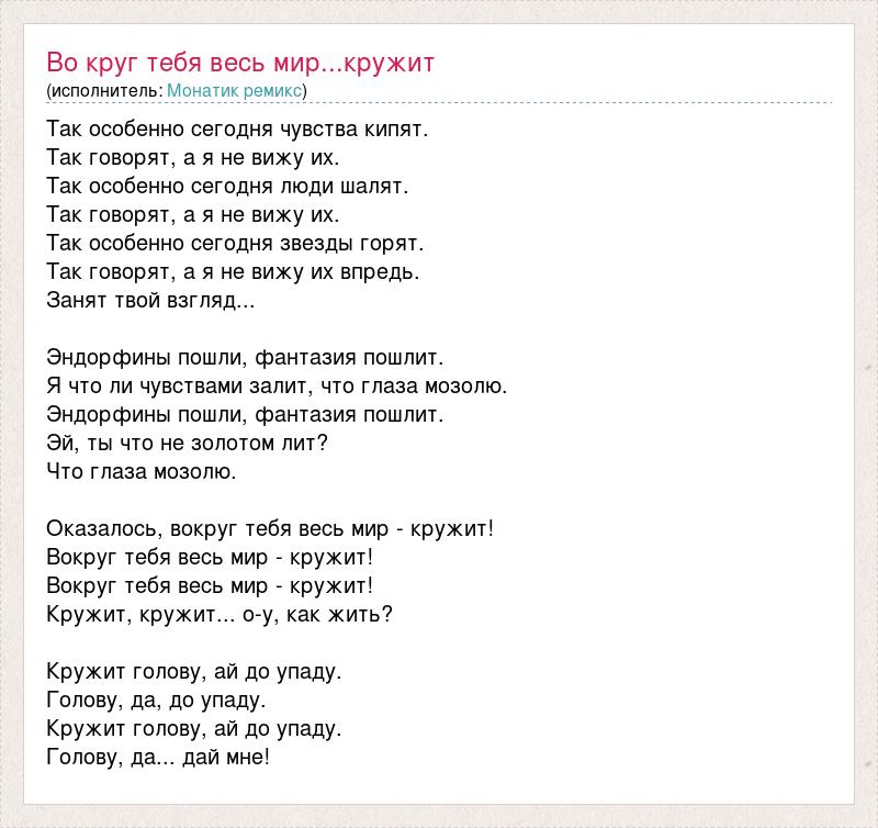 Так особенно сегодня чувства кипят. Так говорят, а я не вижу их. Так особенно сегодня люди шалят. Так говорят, а я не вижу их. Так особенно сегодня звезды горят. Так говорят, а я не вижу их впредь. Занят твой взгляд... Эндорфины пошли, фантазия пошлит. Я что ли чувствами залит, что глаза мозолю. Эндорфины пошли, фантазия пошлит. Эй, ты что не золотом лит? Что глаза мозолю. Оказалось, вокруг тебя весь мир - кружит! Вокруг тебя весь мир - кружит! Вокруг тебя весь мир - кружит! Кружит, кружит... о-у, как жить? Кружит голову, ай до упаду. Голову, да, до упаду. Кружит голову, ай до упаду. Голову, да... дай мне!