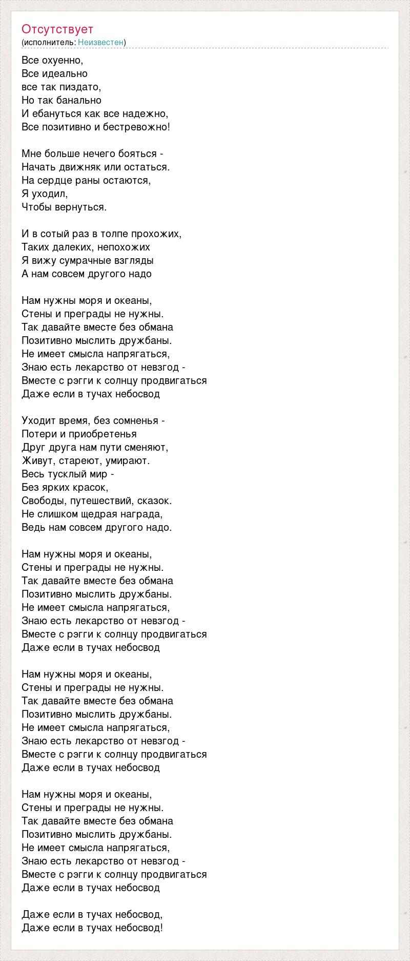 Все охуенно, Все идеально все так пиздато, Но так банально И ебануться как все надежно, Все позитивно и бестревожно! Мне больше нечего бояться - Начать движняк или остаться. На сердце раны остаются, Я уходил, Чтобы вернуться. И в сотый раз в толпе прохожих, Таких далеких, непохожих Я вижу сумрачные взгляды А нам совсем другого надо Нам нужны моря и океаны, Стены и преграды не нужны. Так давайте вместе без обмана Позитивно мыслить дружбаны. Не имеет смысла напрягаться, Знаю есть лекарство от невзгод - Вместе с рэгги к солнцу продвигаться Даже если в тучах небосвод Уходит время, без сомненья - Потери и приобретенья Друг друга нам пути сменяют, Живут, стареют, умирают. Весь тусклый мир - Без ярких красок, Свободы, путешествий, сказок. Не слишком щедрая награда, Ведь нам совсем другого надо. Нам нужны моря и океаны, Стены и преграды не нужны. Так давайте вместе без обмана Позитивно мыслить дружбаны. Не имеет смысла напрягаться, Знаю есть лекарство от невзгод - Вместе с рэгги к солнцу продвигаться Даже если в тучах небосвод Нам нужны моря и океаны, Стены и преграды не нужны. Так давайте вместе без обмана Позитивно мыслить дружбаны. Не имеет смысла напрягаться, Знаю есть лекарство от невзгод - Вместе с рэгги к солнцу продвигаться Даже если в тучах небосвод Нам нужны моря и океаны, Стены и преграды не нужны. Так давайте вместе без обмана Позитивно мыслить дружбаны. Не имеет смысла напрягаться, Знаю есть лекарство от невзгод - Вместе с рэгги к солнцу продвигаться Даже если в тучах небосвод Даже если в тучах небосвод, Даже если в тучах небосвод!