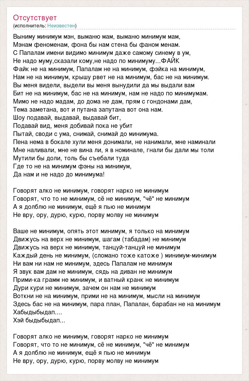 Выниму минимум мэн, выманю мам, выманю минимум мам, Мэнам феноменам, фона бы нам стена бы фаном менам. С Папалам имени видимо минимум даже самому синему в ум, Не надо муму,сказали кому,не надо по минимуму...ФАЙК Файк не на минимум, Папалам не на минимум, фэйка на минимум, Нам не на минимум, крышу рвет не на минимум, бас не на минимум. Вы меня видели, выдели вы меня вынудили да мы выдали вам Бит не на минимум, бас не на минимум, нам не надо по минимумам. Мимо не надо мадам, до дома не дам, прям с гондонами дам, Тема заметана, вот и путана запутана вот она нам. Шоу подавай, выдавай, выдавай бит, Подавай вид, меня добивай пока не убит Пытай, своди с ума, снимай, снимай до минимума. Пена нема в бокале хули меня донимали, не нанимали, мне наминали Мне наливали, мне не вина ли, я в номинале, гнали бы дали мы толи Мутили бы доли, толь бы съебали туда Где то не на минимум фэны на минимум, Да нам и не надо до минимума! Говорят алко не минимум, говорят нарко не минимум Говорят, что то не минимум, сё не минимум, "чё" не минимум А я долблю не минимум, ещё я пью не минимум Не вру, ору, дурю, курю, порву молву не минимум Ваше не минимум, опять этот минимум, я только на минимум Движусь на верх не минимум, шагам (табадам) не минимум Движусь на верх не минимум, танцуй-танцуй не минимум Каждый день не минимум, (сломано тоже катоже ) минимум-минимум Ни вам ни нам не минимум, здесь Папалам не минимум Я звук вам дам не минимум, сядь на диван не минимум Прими-ка грамм не минимум, и ватный кранк не минимум Дури кури не минимум, зачем он нам не минимум Воткни не на минимум, прими не на минимум, мысли на минимум Здесь бас не на минимум, пара план, Папалан, барабан не на минимум Хабыдыбыдап.... Хэй быдыбыдап... Говорят алко не минимум, говорят нарко не минимум Говорят, что то не минимум, сё не минимум, "чё" не минимум А я долблю не минимум, ещё я пью не минимум Не вру, ору, дурю, курю, порву молву не минимум