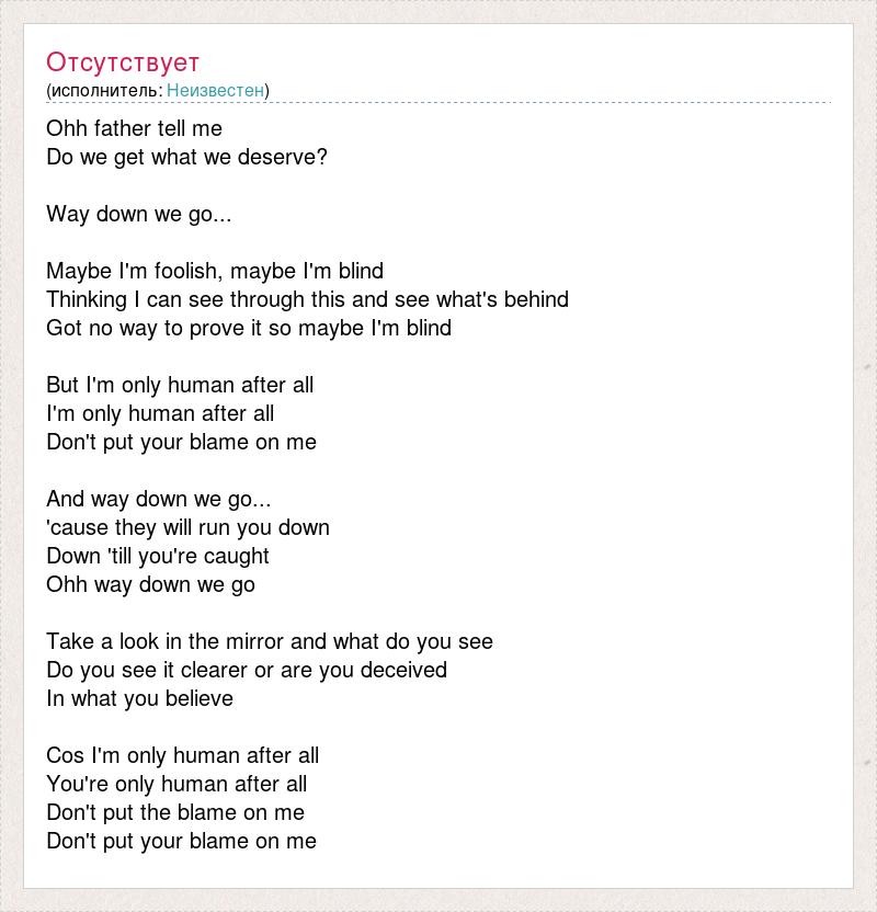 Ohh father tell me Do we get what we deserve? Way down we go... Maybe I'm foolish, maybe I'm blind Thinking I can see through this and see what's behind Got no way to prove it so maybe I'm blind But I'm only human after all I'm only human after all Don't put your blame on me And way down we go... 'cause they will run you down Down 'till you're caught Ohh way down we go Take a look in the mirror and what do you see Do you see it clearer or are you deceived In what you believe Cos I'm only human after all You're only human after all Don't put the blame on me Don't put your blame on me