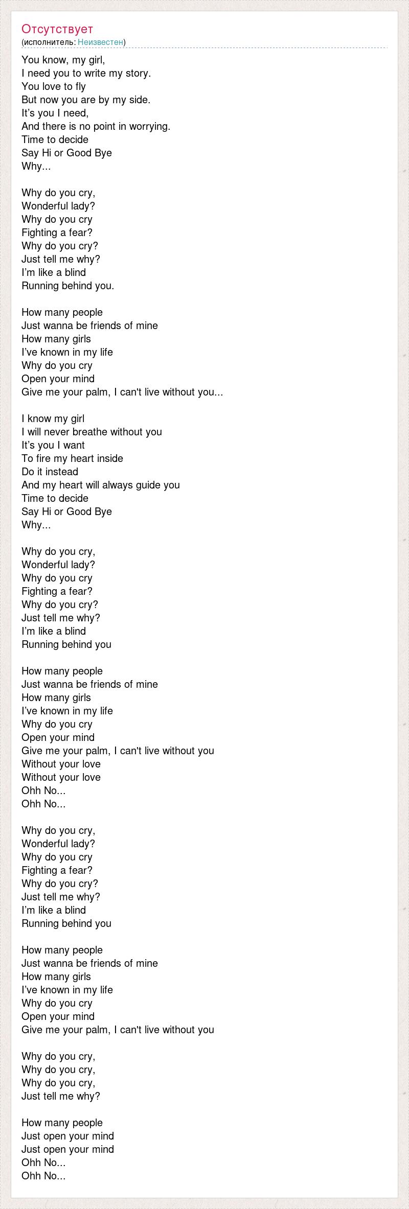 You know, my girl, I need you to write my story. You love to fly But now you are by my side. It’s you I need, And there is no point in worrying. Time to decide Say Hi or Good Bye Why... Why do you cry, Wonderful lady? Why do you cry Fighting a fear? Why do you cry? Just tell me why? I’m like a blind Running behind you. How many people Just wanna be friends of mine How many girls I’ve known in my life Why do you cry Open your mind Give me your palm, I can't live without you... I know my girl I will never breathe without you It’s you I want To fire my heart inside Do it instead And my heart will always guide you Time to decide Say Hi or Good Bye Why... Why do you cry, Wonderful lady? Why do you cry Fighting a fear? Why do you cry? Just tell me why? I’m like a blind Running behind you How many people Just wanna be friends of mine How many girls I’ve known in my life Why do you cry Open your mind Give me your palm, I can't live without you Without your love Without your love Ohh No... Ohh No... Why do you cry, Wonderful lady? Why do you cry Fighting a fear? Why do you cry? Just tell me why? I’m like a blind Running behind you How many people Just wanna be friends of mine How many girls I’ve known in my life Why do you cry Open your mind Give me your palm, I can't live without you Why do you cry, Why do you cry, Why do you cry, Just tell me why? How many people Just open your mind Just open your mind Ohh No... Ohh No...