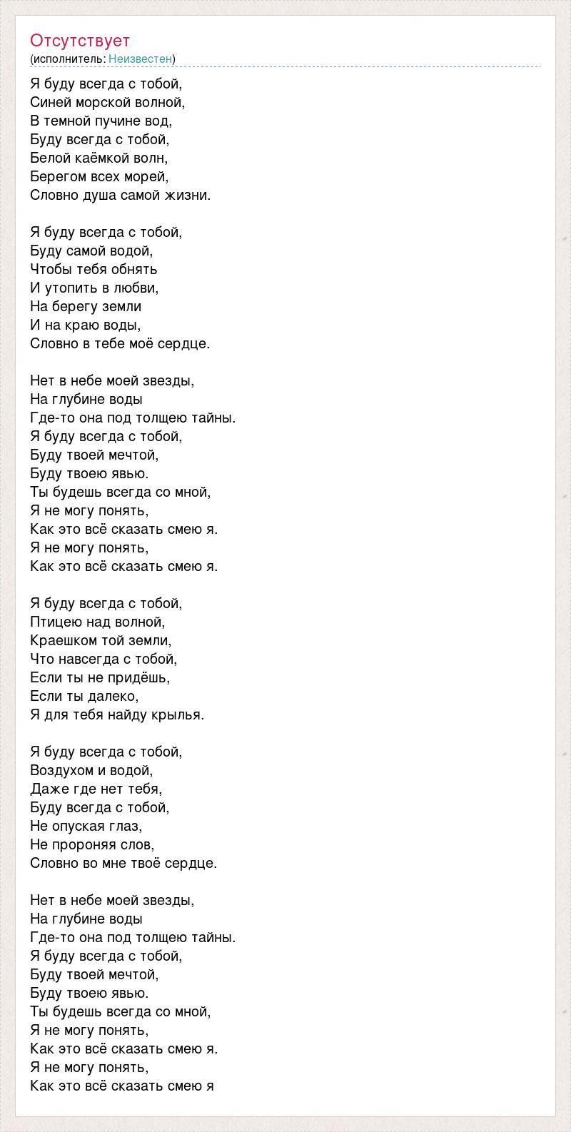 Я буду всегда с тобой, Синей морской волной, В темной пучине вод, Буду всегда с тобой, Белой каёмкой волн, Берегом всех морей, Словно душа самой жизни. Я буду всегда с тобой, Буду самой водой, Чтобы тебя обнять И утопить в любви, На берегу земли И на краю воды, Словно в тебе моё сердце. Нет в небе моей звезды, На глубине воды Где-то она под толщею тайны. Я буду всегда с тобой, Буду твоей мечтой, Буду твоею явью. Ты будешь всегда со мной, Я не могу понять, Как это всё сказать смею я. Я не могу понять, Как это всё сказать смею я. Я буду всегда с тобой, Птицею над волной, Краешком той земли, Что навсегда с тобой, Если ты не придёшь, Если ты далеко, Я для тебя найду крылья. Я буду всегда с тобой, Воздухом и водой, Даже где нет тебя, Буду всегда с тобой, Не опуская глаз, Не пророняя слов, Словно во мне твоё сердце. Нет в небе моей звезды, На глубине воды Где-то она под толщею тайны. Я буду всегда с тобой, Буду твоей мечтой, Буду твоею явью. Ты будешь всегда со мной, Я не могу понять, Как это всё сказать смею я. Я не могу понять, Как это всё сказать смею я