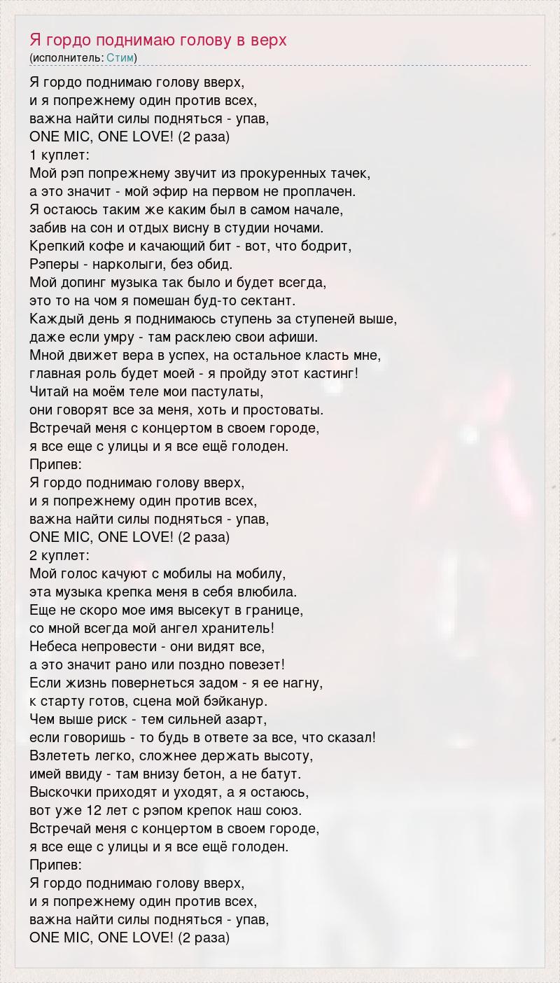 Я гордо поднимаю голову вверх, и я попрежнему один против всех, важна найти силы подняться - упав, ONE MIC, ONE LOVE! (2 раза) 1 куплет: Мой рэп попрежнему звучит из прокуренных тачек, а это значит - мой эфир на первом не проплачен. Я остаюсь таким же каким был в самом начале, забив на сон и отдых висну в студии ночами. Крепкий кофе и качающий бит - вот, что бодрит, Рэперы - нарколыги, без обид. Мой допинг музыка так было и будет всегда, это то на чом я помешан буд-то сектант. Каждый день я поднимаюсь ступень за ступеней выше, даже если умру - там расклею свои афиши. Мной движет вера в успех, на остальное класть мне, главная роль будет моей - я пройду этот кастинг! Читай на моём теле мои пастулаты, они говорят все за меня, хоть и простоваты. Встречай меня с концертом в своем городе, я все еще с улицы и я все ещё голоден. Припев: Я гордо поднимаю голову вверх, и я попрежнему один против всех, важна найти силы подняться - упав, ONE MIC, ONE LOVE! (2 раза) 2 куплет: Мой голос качуют с мобилы на мобилу, эта музыка крепка меня в себя влюбила. Еще не скоро мое имя высекут в границе, со мной всегда мой ангел хранитель! Небеса непровести - они видят все, а это значит рано или поздно повезет! Если жизнь повернеться задом - я ее нагну, к старту готов, сцена мой бэйканур. Чем выше риск - тем сильней азарт, если говоришь - то будь в ответе за все, что сказал! Взлететь легко, сложнее держать высоту, имей ввиду - там внизу бетон, а не батут. Выскочки приходят и уходят, а я остаюсь, вот уже 12 лет с рэпом крепок наш союз. Встречай меня с концертом в своем городе, я все еще с улицы и я все ещё голоден. Припев: Я гордо поднимаю голову вверх, и я попрежнему один против всех, важна найти силы подняться - упав, ONE MIC, ONE LOVE! (2 раза)