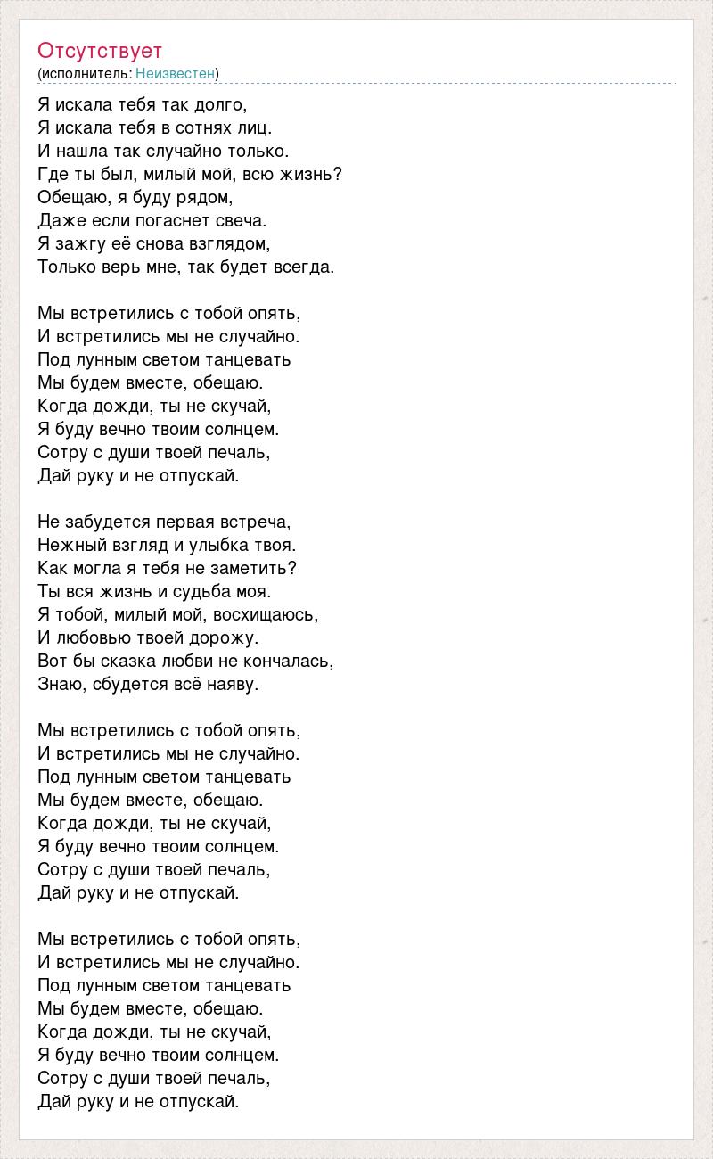 Я искала тебя так долго, Я искала тебя в сотнях лиц. И нашла так случайно только. Где ты был, милый мой, всю жизнь? Обещаю, я буду рядом, Даже если погаснет свеча. Я зажгу её снова взглядом, Только верь мне, так будет всегда. Мы встретились с тобой опять, И встретились мы не случайно. Под лунным светом танцевать Мы будем вместе, обещаю. Когда дожди, ты не скучай, Я буду вечно твоим солнцем. Сотру с души твоей печаль, Дай руку и не отпускай. Не забудется первая встреча, Нежный взгляд и улыбка твоя. Как могла я тебя не заметить? Ты вся жизнь и судьба моя. Я тобой, милый мой, восхищаюсь, И любовью твоей дорожу. Вот бы сказка любви не кончалась, Знаю, сбудется всё наяву. Мы встретились с тобой опять, И встретились мы не случайно. Под лунным светом танцевать Мы будем вместе, обещаю. Когда дожди, ты не скучай, Я буду вечно твоим солнцем. Сотру с души твоей печаль, Дай руку и не отпускай. Мы встретились с тобой опять, И встретились мы не случайно. Под лунным светом танцевать Мы будем вместе, обещаю. Когда дожди, ты не скучай, Я буду вечно твоим солнцем. Сотру с души твоей печаль, Дай руку и не отпускай.