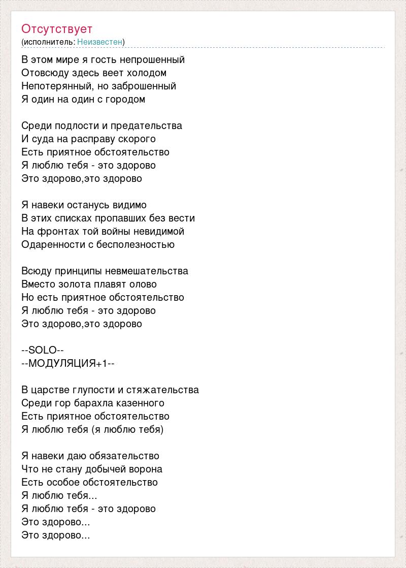 В этом мире я гость непрошенный Отовсюду здесь веет холодом Непотерянный, но заброшенный Я один на один с городом Среди подлости и предательства И суда на расправу скорого Есть приятное обстоятельство Я люблю тебя - это здорово Это здорово,это здорово Я навеки останусь видимо В этих списках пропавших без вести На фронтах той войны невидимой Одаренности с бесполезностью Всюду принципы невмешательства Вместо золота плавят олово Но есть приятное обстоятельство Я люблю тебя - это здорово Это здорово,это здорово --SOLO-- --МОДУЛЯЦИЯ+1-- В царстве глупости и стяжательства Среди гор барахла казенного Есть приятное обстоятельство Я люблю тебя (я люблю тебя) Я навеки даю обязательство Что не стану добычей ворона Есть особое обстоятельство Я люблю тебя... Я люблю тебя - это здорово Это здорово... Это здорово...