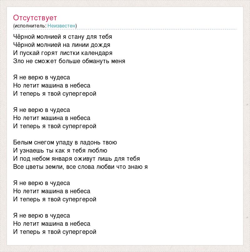 Чёрной молнией я стану для тебя Чёрной молнией на линии дождя И пускай горят листки календаря Зло не сможет больше обмануть меня Я не верю в чудеса Но летит машина в небеса И теперь я твой супергерой Я не верю в чудеса Но летит машина в небеса И теперь я твой супергерой Белым снегом упаду в ладонь твою И узнаешь ты как я тебя люблю И под небом января оживут лишь для тебя Все цветы земли, все слова любви что знаю я Я не верю в чудеса Но летит машина в небеса И теперь я твой супергерой Я не верю в чудеса Но летит машина в небеса И теперь я твой супергерой