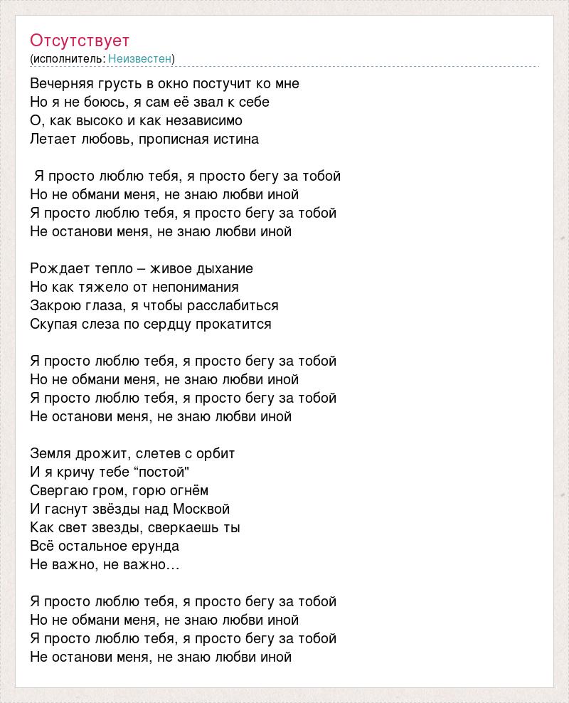 Вечерняя грусть в окно постучит ко мне Но я не боюсь, я сам её звал к себе О, как высоко и как независимо Летает любовь, прописная истина Я просто люблю тебя, я просто бегу за тобой Но не обмани меня, не знаю любви иной Я просто люблю тебя, я просто бегу за тобой Не останови меня, не знаю любви иной Рождает тепло – живое дыхание Но как тяжело от непонимания Закрою глаза, я чтобы расслабиться Скупая слеза по сердцу прокатится Я просто люблю тебя, я просто бегу за тобой Но не обмани меня, не знаю любви иной Я просто люблю тебя, я просто бегу за тобой Не останови меня, не знаю любви иной Земля дрожит, слетев с орбит И я кричу тебе “постой" Свергаю гром, горю огнём И гаснут звёзды над Москвой Как свет звезды, сверкаешь ты Всё остальное ерунда Не важно, не важно… Я просто люблю тебя, я просто бегу за тобой Но не обмани меня, не знаю любви иной Я просто люблю тебя, я просто бегу за тобой Не останови меня, не знаю любви иной