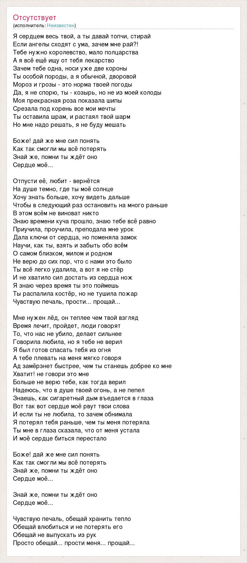 Я сердцем весь твой, а ты давай топчи, стирай Если ангелы сходят с ума, зачем мне рай?! Тебе нужно королевство, мало полцарства А я всё ещё ищу от тебя лекарство Зачем тебе одна, носи уже две короны Ты особой породы, а я обычной, дворовой Мороз и грозы - это норма твоей погоды Да, я не спорю, ты - козырь, но не из моей колоды Моя прекрасная роза показала шипы Срезала под корень все мои мечты Ты оставила шрам, и растаял твой шарм Но мне надо решать, я не буду мешать Боже! дай же мне сил понять Как так смогли мы всё потерять Знай же, помни ты ждёт оно Сердце моё... Отпусти её, любит - вернётся На душе темно, где ты моё солнце Хочу знать больше, хочу видеть дальше Чтобы в следующий раз остановить на много раньше В этом всём не виноват никто Знаю времени куча прошло, знаю тебе всё равно Приучила, проучила, преподала мне урок Дала ключи от сердца, но поменяла замок Научи, как ты, взять и забыть обо всём О самом близком, милом и родном Не верю до сих пор, что с нами это было Ты всё легко удалила, а вот я не стёр И не хватило сил достать из сердца нож Я знаю через время ты это поймешь Ты распалила костёр, но не тушила пожар Чувствую печаль, прости... прощай... Мне нужен лёд, он теплее чем твой взгляд Время лечит, пройдет, люди говорят То, что нас не убило, делает сильнее Говорила любила, но я тебе не верил Я был готов спасать тебя из огня А тебе плевать на меня мягко говоря Ад замёрзнет быстрее, чем ты станешь добрее ко мне Хватит! не говори это мне Больше не верю тебе, как тогда верил Надеюсь, что в душе твоей огонь, а не пепел Знаешь, как сигаретный дым въедается в глаза Вот так вот сердце моё рвут твои слова И если ты не любила, то зачем обнимала Я потерял тебя раньше, чем ты меня потеряла Ты мне в глаза сказала, что от меня устала И моё сердце биться перестало Боже! дай же мне сил понять Как так смогли мы всё потерять Знай же, помни ты ждёт оно Сердце моё... Знай же, помни ты ждёт оно Сердце моё... Чувствую печаль, обещай хранить тепло Обещай влюбиться и не потерять его Обещай не выпускать из рук Просто обещай... прости меня... прощай...