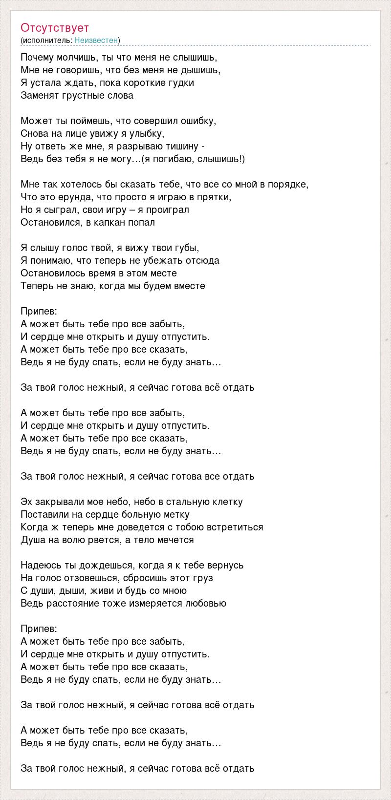Почему молчишь, ты что меня не слышишь, Мне не говоришь, что без меня не дышишь, Я устала ждать, пока короткие гудки Заменят грустные слова Может ты поймешь, что совершил ошибку, Снова на лице увижу я улыбку, Ну ответь же мне, я разрываю тишину - Ведь без тебя я не могу…(я погибаю, слышишь!) Мне так хотелось бы сказать тебе, что все со мной в порядке, Что это ерунда, что просто я играю в прятки, Но я сыграл, свои игру – я проиграл Остановился, в капкан попал Я слышу голос твой, я вижу твои губы, Я понимаю, что теперь не убежать отсюда Остановилось время в этом месте Теперь не знаю, когда мы будем вместе Припев: А может быть тебе про все забыть, И сердце мне открыть и душу отпустить. А может быть тебе про все сказать, Ведь я не буду спать, если не буду знать… За твой голос нежный, я сейчас готова всё отдать А может быть тебе про все забыть, И сердце мне открыть и душу отпустить. А может быть тебе про все сказать, Ведь я не буду спать, если не буду знать… За твой голос нежный, я сейчас готова все отдать Эх закрывали мое небо, небо в стальную клетку Поставили на сердце больную метку Когда ж теперь мне доведется с тобою встретиться Душа на волю рвется, а тело мечется Надеюсь ты дождешься, когда я к тебе вернусь На голос отзовешься, сбросишь этот груз С души, дыши, живи и будь со мною Ведь расстояние тоже измеряется любовью Припев: А может быть тебе про все забыть, И сердце мне открыть и душу отпустить. А может быть тебе про все сказать, Ведь я не буду спать, если не буду знать… За твой голос нежный, я сейчас готова всё отдать А может быть тебе про все сказать, Ведь я не буду спать, если не буду знать… За твой голос нежный, я сейчас готова всё отдать