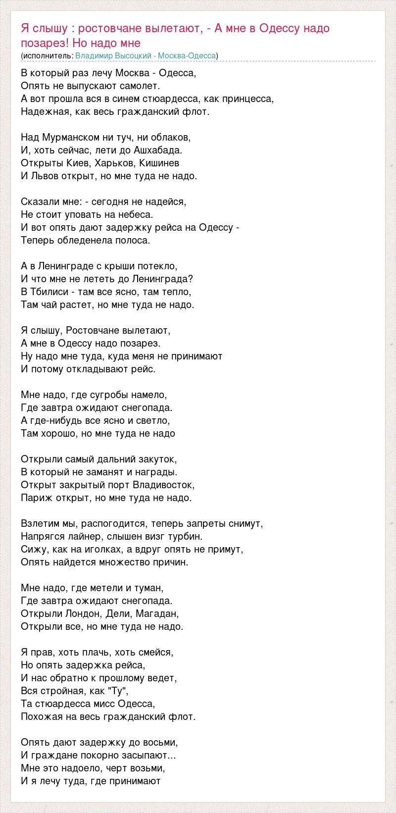 В который раз лечу Москва - Одесса, Опять не выпускают самолет. А вот прошла вся в синем стюардесса, как принцесса, Надежная, как весь гражданский флот. Над Мурманском ни туч, ни облаков, И, хоть сейчас, лети до Ашхабада. Открыты Киев, Харьков, Кишинев И Львов открыт, но мне туда не надо. Сказали мне: - сегодня не надейся, Не стоит уповать на небеса. И вот опять дают задержку рейса на Одессу - Теперь обледенела полоса. А в Ленинграде с крыши потекло, И что мне не лететь до Ленинграда? В Тбилиси - там все ясно, там тепло, Там чай растет, но мне туда не надо. Я слышу, Ростовчане вылетают, А мне в Одессу надо позарез. Ну надо мне туда, куда меня не принимают И потому откладывают рейс. Мне надо, где сугробы намело, Где завтра ожидают снегопада. А где-нибудь все ясно и светло, Там хорошо, но мне туда не надо Открыли самый дальний закуток, В который не заманят и награды. Открыт закрытый порт Владивосток, Париж открыт, но мне туда не надо. Взлетим мы, распогодится, теперь запреты снимут, Напрягся лайнер, слышен визг турбин. Сижу, как на иголках, а вдруг опять не примут, Опять найдется множество причин. Мне надо, где метели и туман, Где завтра ожидают снегопада. Открыли Лондон, Дели, Магадан, Открыли все, но мне туда не надо. Я прав, хоть плачь, хоть смейся, Но опять задержка рейса, И нас обратно к прошлому ведет, Вся стройная, как "Ту", Та стюардесса мисс Одесса, Похожая на весь гражданский флот. Опять дают задержку до восьми, И граждане покорно засыпают... Мне это надоело, черт возьми, И я лечу туда, где принимают