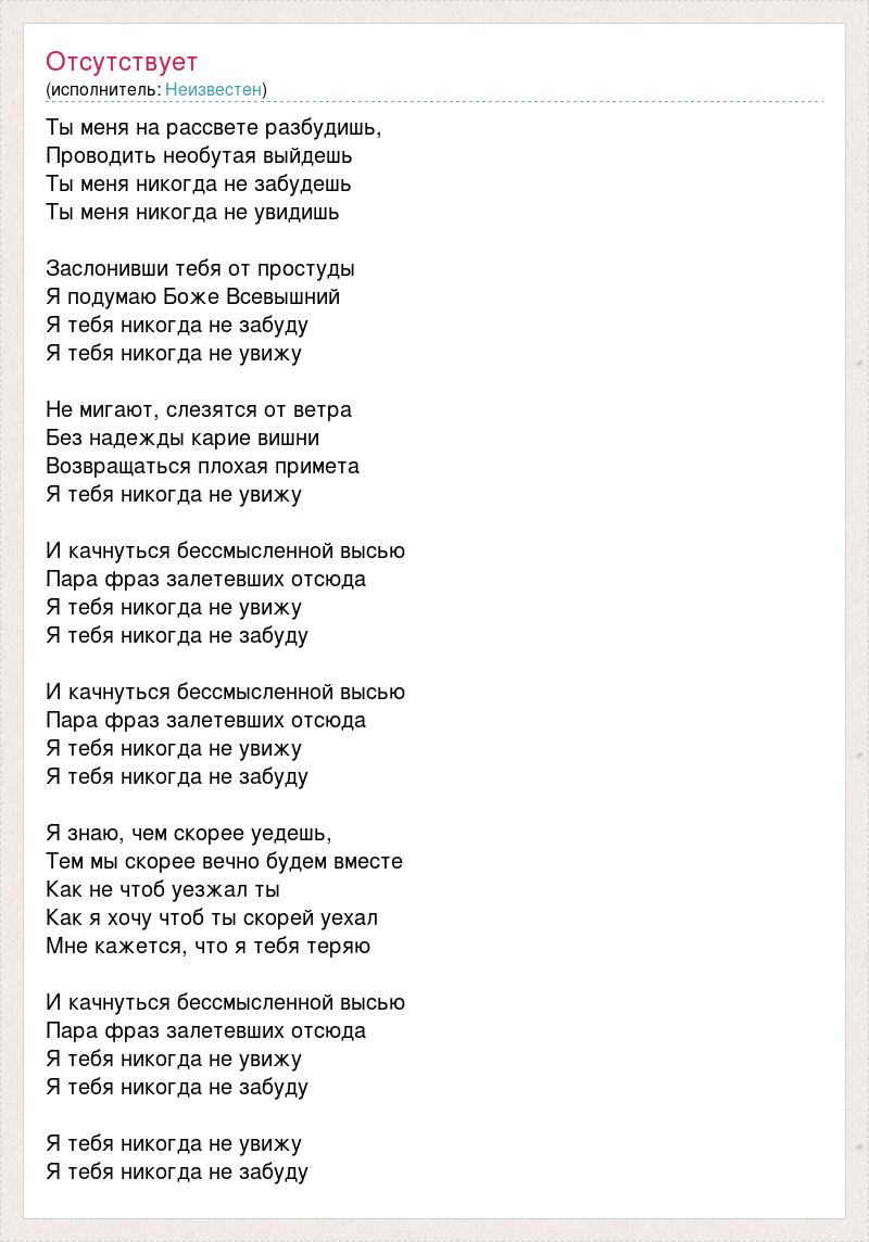 Ты меня на рассвете разбудишь, Проводить необутая выйдешь Ты меня никогда не забудешь Ты меня никогда не увидишь Заслонивши тебя от простуды Я подумаю Боже Всевышний Я тебя никогда не забуду Я тебя никогда не увижу Не мигают, слезятся от ветра Без надежды карие вишни Возвращаться плохая примета Я тебя никогда не увижу И качнуться бессмысленной высью Пара фраз залетевших отсюда Я тебя никогда не увижу Я тебя никогда не забуду И качнуться бессмысленной высью Пара фраз залетевших отсюда Я тебя никогда не увижу Я тебя никогда не забуду Я знаю, чем скорее уедешь, Тем мы скорее вечно будем вместе Как не чтоб уезжал ты Как я хочу чтоб ты скорей уехал Мне кажется, что я тебя теряю И качнуться бессмысленной высью Пара фраз залетевших отсюда Я тебя никогда не увижу Я тебя никогда не забуду Я тебя никогда не увижу Я тебя никогда не забуду