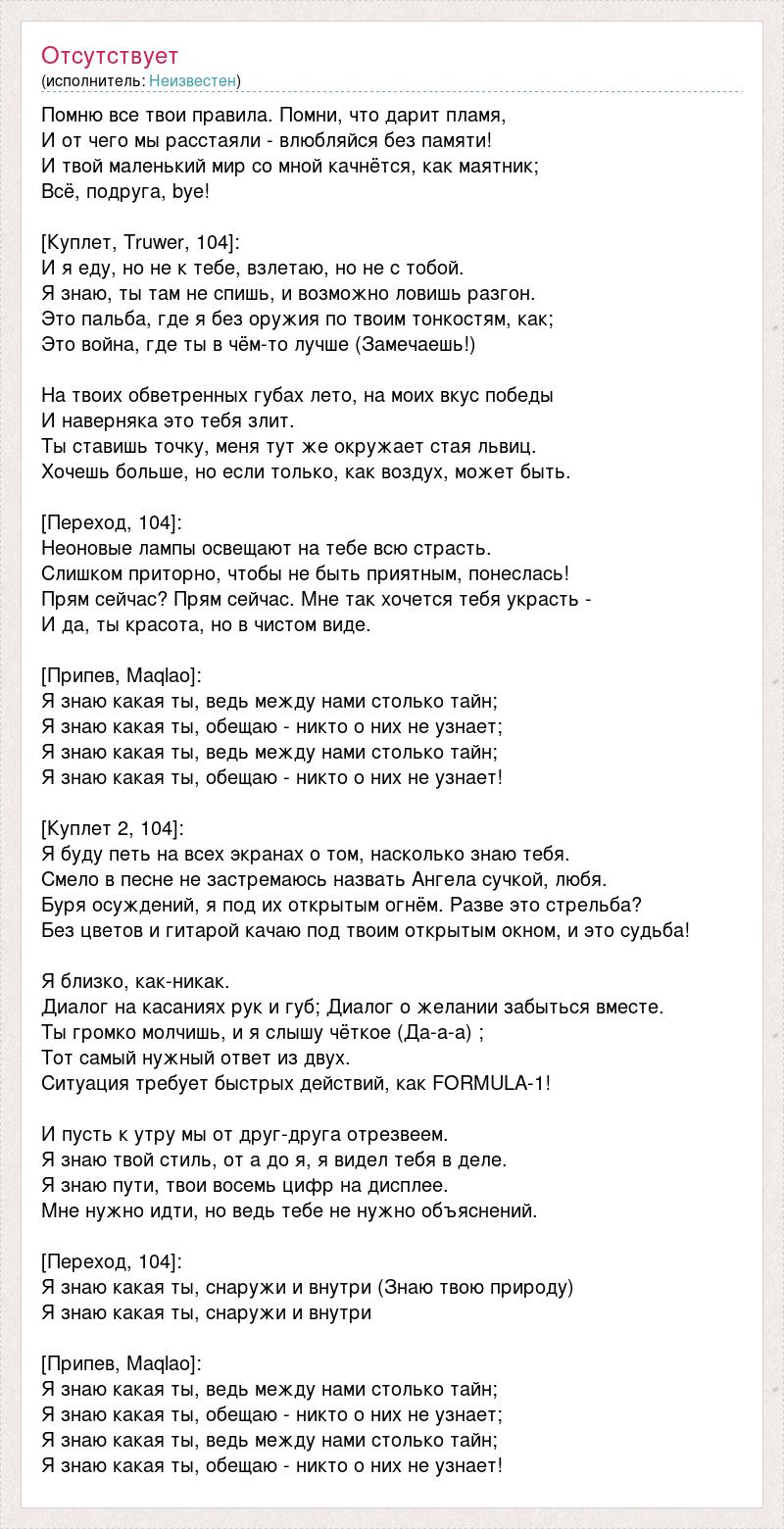 Помню все твои правила. Помни, что дарит пламя, И от чего мы расстаяли - влюбляйся без памяти! И твой маленький мир со мной качнётся, как маятник; Всё, подруга, bye! [Куплет, Truwer, 104]: И я еду, но не к тебе, взлетаю, но не с тобой. Я знаю, ты там не спишь, и возможно ловишь разгон. Это пальба, где я без оружия по твоим тонкостям, как; Это война, где ты в чём-то лучше (Замечаешь!) На твоих обветренных губах лето, на моих вкус победы И наверняка это тебя злит. Ты ставишь точку, меня тут же окружает стая львиц. Хочешь больше, но если только, как воздух, может быть. [Переход, 104]: Неоновые лампы освещают на тебе всю страсть. Слишком приторно, чтобы не быть приятным, понеслась! Прям сейчас? Прям сейчас. Мне так хочется тебя украсть - И да, ты красота, но в чистом виде. [Припев, Maqlao]: Я знаю какая ты, ведь между нами столько тайн; Я знаю какая ты, обещаю - никто о них не узнает; Я знаю какая ты, ведь между нами столько тайн; Я знаю какая ты, обещаю - никто о них не узнает! [Куплет 2, 104]: Я буду петь на всех экранах о том, насколько знаю тебя. Смело в песне не застремаюсь назвать Ангела сучкой, любя. Буря осуждений, я под их открытым огнём. Разве это стрельба? Без цветов и гитарой качаю под твоим открытым окном, и это судьба! Я близко, как-никак. Диалог на касаниях рук и губ; Диалог о желании забыться вместе. Ты громко молчишь, и я слышу чёткое (Да-а-а) ; Тот самый нужный ответ из двух. Ситуация требует быстрых действий, как FORMULA-1! И пусть к утру мы от друг-друга отрезвеем. Я знаю твой стиль, от а до я, я видел тебя в деле. Я знаю пути, твои восемь цифр на дисплее. Мне нужно идти, но ведь тебе не нужно объяснений. [Переход, 104]: Я знаю какая ты, снаружи и внутри (Знаю твою природу) Я знаю какая ты, снаружи и внутри [Припев, Maqlao]: Я знаю какая ты, ведь между нами столько тайн; Я знаю какая ты, обещаю - никто о них не узнает; Я знаю какая ты, ведь между нами столько тайн; Я знаю какая ты, обещаю - никто о них не узнает!