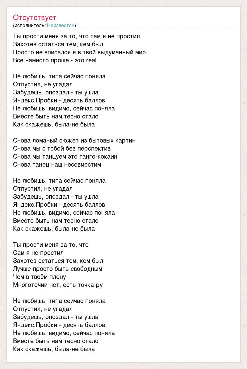 Ты прости меня за то, что сам я не простил Захотев остаться тем, кем был Просто не вписался я в твой выдуманный мир Всё намного проще - это real Не любишь, типа сейчас поняла Отпустил, не угадал Забудешь, опоздал - ты ушла Яндекс.Пробки - десять баллов Не любишь, видимо, сейчас поняла Вместе быть нам тесно стало Как скажешь, была-не была Снова ломаный сюжет из бытовых картин Снова мы с тобой без перспектив Снова мы танцуем это танго-кокаин Снова танец наш несовместим Не любишь, типа сейчас поняла Отпустил, не угадал Забудешь, опоздал - ты ушла Яндекс.Пробки - десять баллов Не любишь, видимо, сейчас поняла Вместе быть нам тесно стало Как скажешь, была-не была Ты прости меня за то, что Сам я не простил Захотев остаться тем, кем был Лучше просто быть свободным Чем в твоём плену Многоточий нет, есть точка-ру Не любишь, типа сейчас поняла Отпустил, не угадал Забудешь, опоздал - ты ушла Яндекс.Пробки - десять баллов Не любишь, видимо, сейчас поняла Вместе быть нам тесно стало Как скажешь, была-не была