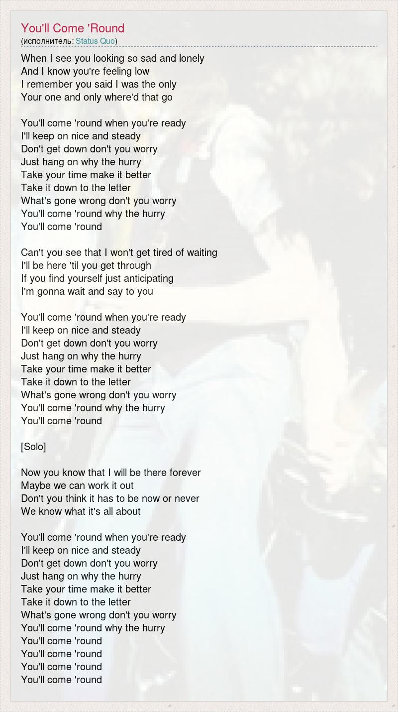 When I see you looking so sad and lonely And I know you're feeling low I remember you said I was the only Your one and only where'd that go You'll come 'round when you're ready I'll keep on nice and steady Don't get down don't you worry Just hang on why the hurry Take your time make it better Take it down to the letter What's gone wrong don't you worry You'll come 'round why the hurry You'll come 'round Can't you see that I won't get tired of waiting I'll be here 'til you get through If you find yourself just anticipating I'm gonna wait and say to you You'll come 'round when you're ready I'll keep on nice and steady Don't get down don't you worry Just hang on why the hurry Take your time make it better Take it down to the letter What's gone wrong don't you worry You'll come 'round why the hurry You'll come 'round [Solo] Now you know that I will be there forever Maybe we can work it out Don't you think it has to be now or never We know what it's all about You'll come 'round when you're ready I'll keep on nice and steady Don't get down don't you worry Just hang on why the hurry Take your time make it better Take it down to the letter What's gone wrong don't you worry You'll come 'round why the hurry You'll come 'round You'll come 'round You'll come 'round You'll come 'round