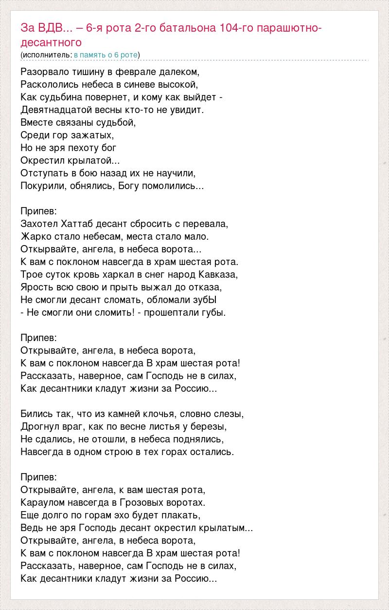 Разорвало тишину в феврале далеком, Раскололись небеса в синеве высокой, Как судьбина повернет, и кому как выйдет - Девятнадцатой весны кто-то не увидит. Вместе связаны судьбой, Среди гор зажатых, Но не зря пехоту бог Окрестил крылатой... Отступать в бою назад их не научили, Покурили, обнялись, Богу помолились... Припев: Захотел Хаттаб десант сбросить с перевала, Жарко стало небесам, места стало мало. Откырвайте, ангела, в небеса ворота... К вам с поклоном навсегда в храм шестая рота. Трое суток кровь харкал в снег народ Кавказа, Ярость всю свою и прыть выжал до отказа, Не смогли десант сломать, обломали зубЫ - Не смогли они сломить! - прошептали губы. Припев: Открывайте, ангела, в небеса ворота, К вам с поклоном навсегда В храм шестая рота! Рассказать, наверное, сам Господь не в силах, Как десантники кладут жизни за Россию... Бились так, что из камней клочья, словно слезы, Дрогнул враг, как по весне листья у березы, Не сдались, не отошли, в небеса поднялись, Навсегда в одном строю в тех горах остались. Припев: Открывайте, ангела, к вам шестая рота, Караулом навсегда в Грозовых воротах. Еще долго по горам эхо будет плакать, Ведь не зря Господь десант окрестил крылатым... Открывайте, ангела, в небеса ворота, К вам с поклоном навсегда В храм шестая рота! Рассказать, наверное, сам Господь не в силах, Как десантники кладут жизни за Россию...