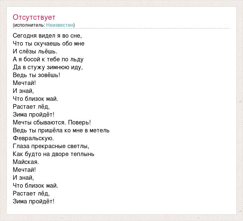 Сегодня видел я во сне, Что ты скучаешь обо мне И слёзы льёшь. А я босой к тебе по льду Да в стужу зимнюю иду, Ведь ты зовёшь! Мечтай! И знай, Что близок май. Растает лёд, Зима пройдёт! Мечты сбываются. Поверь! Ведь ты пришёла ко мне в метель Февральскую. Глаза прекрасные светлы, Как будто на дворе теплынь Mайская. Мечтай! И знай, Что близок май. Растает лёд, Зима пройдёт!