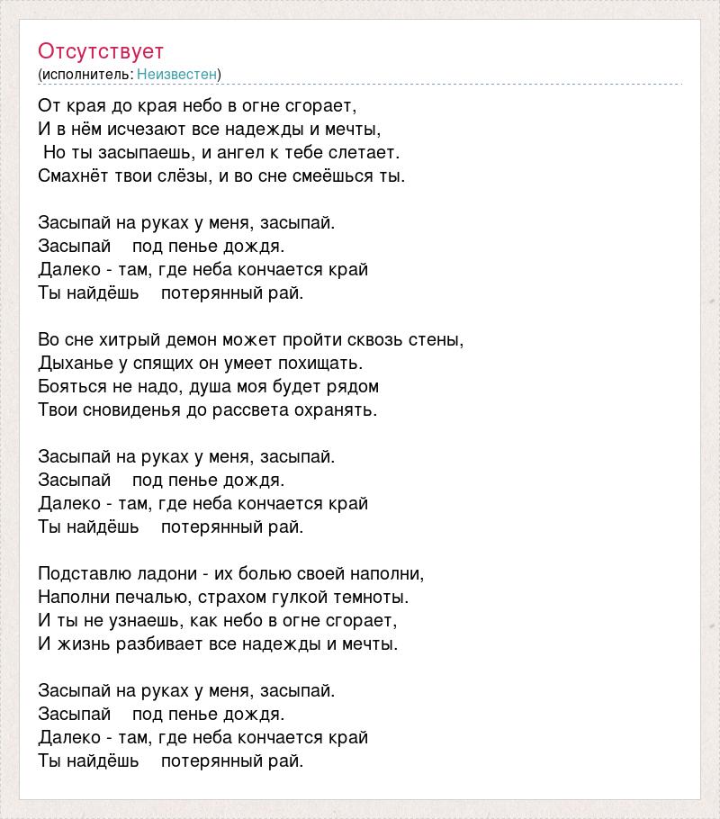От края до края небо в огне сгорает, И в нём исчезают все надежды и мечты, Но ты засыпаешь, и ангел к тебе слетает. Смахнёт твои слёзы, и во сне смеёшься ты. Засыпай на руках у меня, засыпай. Засыпай под пенье дождя. Далеко - там, где неба кончается край Ты найдёшь потерянный рай. Во сне хитрый демон может пройти сквозь стены, Дыханье у спящих он умеет похищать. Бояться не надо, душа моя будет рядом Твои сновиденья до рассвета охранять. Засыпай на руках у меня, засыпай. Засыпай под пенье дождя. Далеко - там, где неба кончается край Ты найдёшь потерянный рай. Подставлю ладони - их болью своей наполни, Наполни печалью, страхом гулкой темноты. И ты не узнаешь, как небо в огне сгорает, И жизнь разбивает все надежды и мечты. Засыпай на руках у меня, засыпай. Засыпай под пенье дождя. Далеко - там, где неба кончается край Ты найдёшь потерянный рай.