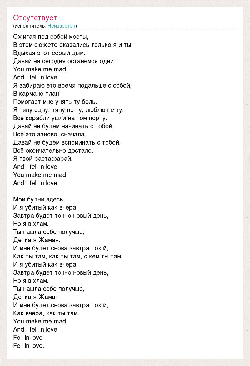 Сжигая под собой мосты, В этом сюжете оказались только я и ты. Вдыхая этот серый дым. Давай на сегодня останемся одни. You make me mad And I fell in love Я забираю это время подальше с собой, В кармане план Помогает мне унять ту боль. Я тяну одну, тяну не ту, люблю не ту. Все корабли ушли на том порту. Давай не будем начинать с тобой, Всё это заново, сначала. Давай не будем вспоминать с тобой, Всё окончательно достало. Я твой растафарай. And I fell in love You make me mad And I fell in love Мои будни здесь, И я убитый как вчера. Завтра будет точно новый день, Но я в хлам. Ты нашла себе получше, Детка я Жаман. И мне будет снова завтра пох.й, Как ты там, как ты там, с кем ты там. И я убитый как вчера. Завтра будет точно новый день, Но я в хлам. Ты нашла себе получше, Детка я Жаман И мне будет снова завтра пох.й, Как вчера, как ты там. You make me mad And I fell in love Fell in love Fell in love.