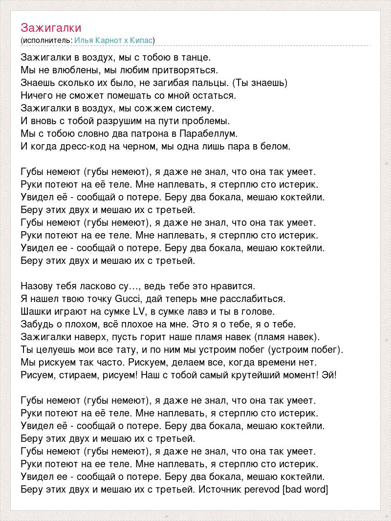 Зажигалки в воздух, мы с тобою в танце. Мы не влюблены, мы любим притворяться. Знаешь сколько их было, не загибая пальцы. (Ты знаешь) Ничего не сможет помешать со мной остаться. Зажигалки в воздух, мы сожжем систему. И вновь с тобой разрушим на пути проблемы. Мы с тобою словно два патрона в Парабеллум. И когда дресс-код на черном, мы одна лишь пара в белом. Губы немеют (губы немеют), я даже не знал, что она так умеет. Руки потеют на её теле. Мне наплевать, я стерплю сто истерик. Увидел её - сообщай о потере. Беру два бокала, мешаю коктейли. Беру этих двух и мешаю их с третьей. Губы немеют (губы немеют), я даже не знал, что она так умеет. Руки потеют на ее теле. Мне наплевать, я стерплю сто истерик. Увидел ее - сообщай о потере. Беру два бокала, мешаю коктейли. Беру этих двух и мешаю их с третьей. Назову тебя ласково су…, ведь тебе это нравится. Я нашел твою точку Gucci, дай теперь мне расслабиться. Шашки играют на сумке LV, в сумке лавэ и ты в голове. Забудь о плохом, всё плохое на мне. Это я о тебе, я о тебе. Зажигалки наверх, пусть горит наше пламя навек (пламя навек). Ты целуешь мои все тату, и по ним мы устроим побег (устроим побег). Мы рискуем так часто. Рискуем, делаем все, когда времени нет. Рисуем, стираем, рисуем! Наш с тобой самый крутейший момент! Эй! Губы немеют (губы немеют), я даже не знал, что она так умеет. Руки потеют на её теле. Мне наплевать, я стерплю сто истерик. Увидел её - сообщай о потере. Беру два бокала, мешаю коктейли. Беру этих двух и мешаю их с третьей. Губы немеют (губы немеют), я даже не знал, что она так умеет. Руки потеют на ее теле. Мне наплевать, я стерплю сто истерик. Увидел ее - сообщай о потере. Беру два бокала, мешаю коктейли. Беру этих двух и мешаю их с третьей. Источник perevod [bad word]