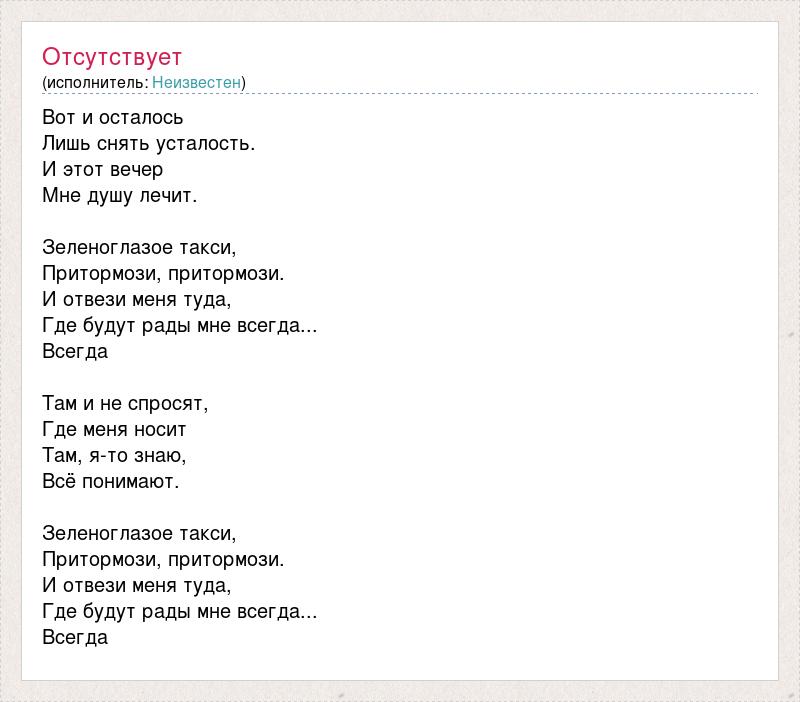 Вот и осталось Лишь снять усталость. И этот вечер Мне душу лечит. Зеленоглазое такси, Притормози, притормози. И отвези меня туда, Где будут рады мне всегда... Всегда Там и не спросят, Где меня носит Там, я-то знаю, Всё понимают. Зеленоглазое такси, Притормози, притормози. И отвези меня туда, Где будут рады мне всегда... Всегда