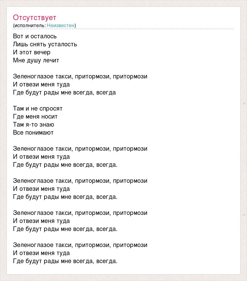 Вот и осталось Лишь снять усталость И этот вечер Мне душу лечит Зеленоглазое такси, притормози, притормози И отвези меня туда Где будут рады мне всегда, всегда Там и не спросят Где меня носит Там я-то знаю Все понимают Зеленоглазое такси, притормози, притормози И отвези меня туда Где будут рады мне всегда, всегда. Зеленоглазое такси, притормози, притормози И отвези меня туда Где будут рады мне всегда, всегда. Зеленоглазое такси, притормози, притормози И отвези меня туда Где будут рады мне всегда, всегда. Зеленоглазое такси, притормози, притормози И отвези меня туда Где будут рады мне всегда, всегда.