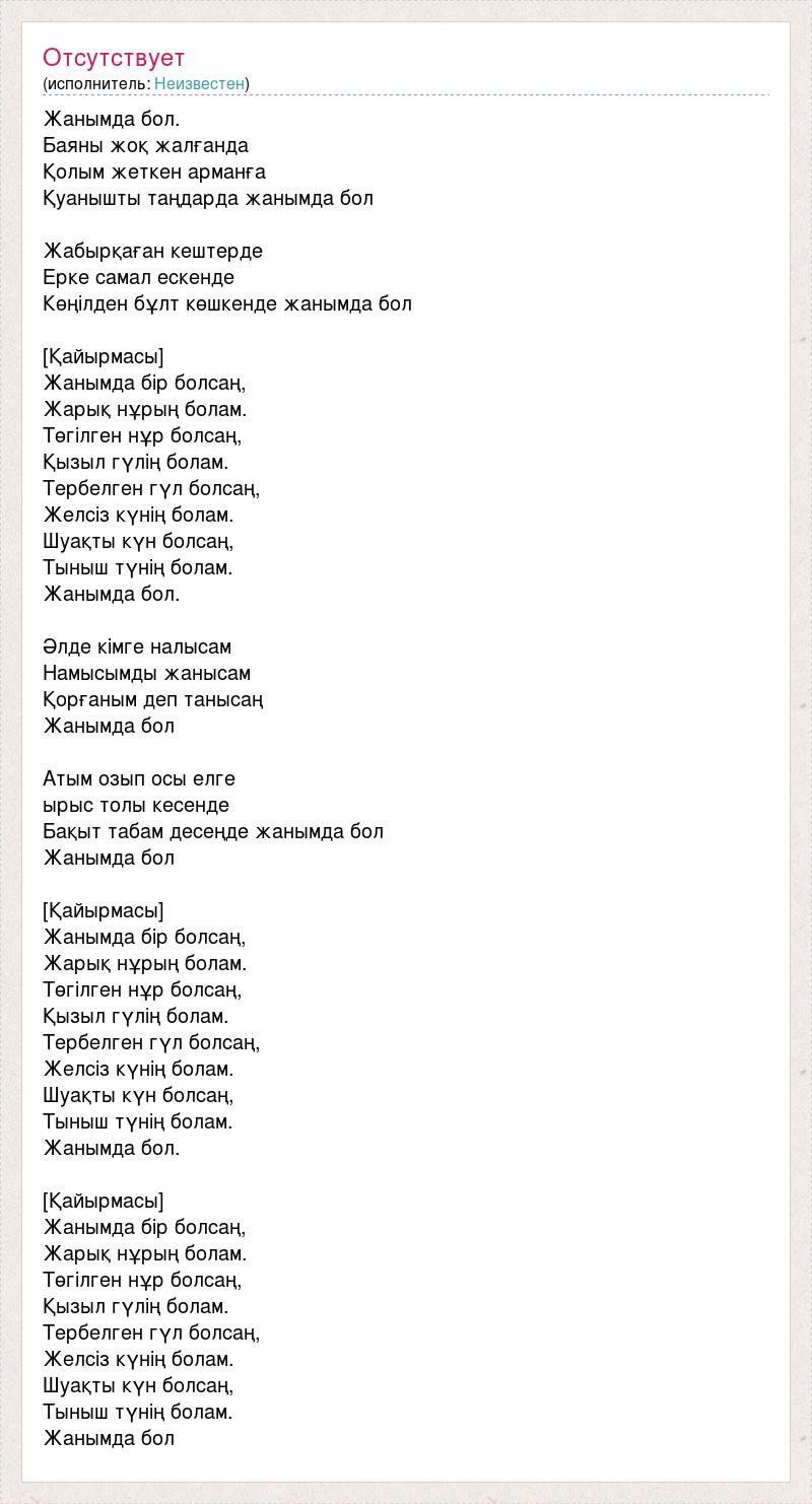 Жанымда бол. Баяны жоқ жалғанда Қолым жеткен арманға Қуанышты таңдарда жанымда бол Жабырқаған кештерде Ерке самал ескенде Көңілден бұлт көшкенде жанымда бол [Қайырмасы] Жанымда бір болсаң, Жарық нұрың болам. Төгілген нұр болсаң, Қызыл гүлің болам. Тербелген гүл болсаң, Желсіз күнің болам. Шуақты күн болсаң, Тыныш түнің болам. Жанымда бол. Әлде кімге налысам Намысымды жанысам Қорғаным деп танысаң Жанымда бол Атым озып осы елге ырыс толы кесенде Бақыт табам десеңде жанымда бол Жанымда бол [Қайырмасы] Жанымда бір болсаң, Жарық нұрың болам. Төгілген нұр болсаң, Қызыл гүлің болам. Тербелген гүл болсаң, Желсіз күнің болам. Шуақты күн болсаң, Тыныш түнің болам. Жанымда бол. [Қайырмасы] Жанымда бір болсаң, Жарық нұрың болам. Төгілген нұр болсаң, Қызыл гүлің болам. Тербелген гүл болсаң, Желсіз күнің болам. Шуақты күн болсаң, Тыныш түнің болам. Жанымда бол