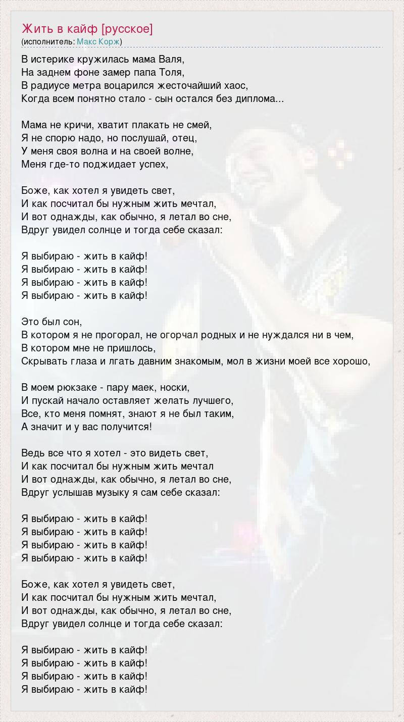 В истерике кружилась мама Валя, На заднем фоне замер папа Толя, В радиусе метра воцарился жесточайший хаос, Когда всем понятно стало - сын остался без диплома... Мама не кричи, хватит плакать не смей, Я не спорю надо, но послушай, отец, У меня своя волна и на своей волне, Меня где-то поджидает успех, Боже, как хотел я увидеть свет, И как посчитал бы нужным жить мечтал, И вот однажды, как обычно, я летал во сне, Вдруг увидел солнце и тогда себе сказал: Я выбираю - жить в кайф! Я выбираю - жить в кайф! Я выбираю - жить в кайф! Я выбираю - жить в кайф! Это был сон, В котором я не прогорал, не огорчал родных и не нуждался ни в чем, В котором мне не пришлось, Скрывать глаза и лгать давним знакомым, мол в жизни моей все хорошо, В моем рюкзаке - пару маек, носки, И пускай начало оставляет желать лучшего, Все, кто меня помнят, знают я не был таким, А значит и у вас получится! Ведь все что я хотел - это видеть свет, И как посчитал бы нужным жить мечтал И вот однажды, как обычно, я летал во сне, Вдруг услышав музыку я сам себе сказал: Я выбираю - жить в кайф! Я выбираю - жить в кайф! Я выбираю - жить в кайф! Я выбираю - жить в кайф! Боже, как хотел я увидеть свет, И как посчитал бы нужным жить мечтал, И вот однажды, как обычно, я летал во сне, Вдруг увидел солнце и тогда себе сказал: Я выбираю - жить в кайф! Я выбираю - жить в кайф! Я выбираю - жить в кайф! Я выбираю - жить в кайф!
