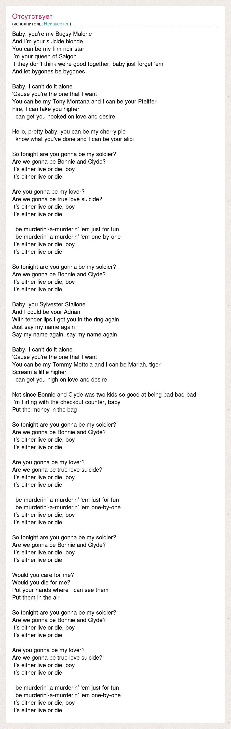Baby, you’re my Bugsy Malone And I’m your suicide blonde You can be my film noir star I’m your queen of Saigon If they don’t think we’re good together, baby just forget ‘em And let bygones be bygones Baby, I can’t do it alone ‘Cause you’re the one that I want You can be my Tony Montana and I can be your Pfeiffer Fire, I can take you higher I can get you hooked on love and desire Hello, pretty baby, you can be my cherry pie I know what you’ve done and I can be your alibi So tonight are you gonna be my soldier? Are we gonna be Bonnie and Clyde? It’s either live or die, boy It’s either live or die Are you gonna be my lover? Are we gonna be true love suicide? It’s either live or die, boy It’s either live or die I be murderin’-a-murderin’ ‘em just for fun I be murderin’-a-murderin’ ‘em one-by-one It’s either live or die, boy It’s either live or die So tonight are you gonna be my soldier? Are we gonna be Bonnie and Clyde? It’s either live or die, boy It’s either live or die Baby, you Sylvester Stallone And I could be your Adrian With tender lips I got you in the ring again Just say my name again Say my name again, say my name again Baby, I can’t do it alone ‘Cause you’re the one that I want You can be my Tommy Mottola and I can be Mariah, tiger Scream a little higher I can get you high on love and desire Not since Bonnie and Clyde was two kids so good at being bad-bad-bad I’m flirting with the checkout counter, baby Put the money in the bag So tonight are you gonna be my soldier? Are we gonna be Bonnie and Clyde? It’s either live or die, boy It’s either live or die Are you gonna be my lover? Are we gonna be true love suicide? It’s either live or die, boy It’s either live or die I be murderin’-a-murderin’ ‘em just for fun I be murderin’-a-murderin’ ‘em one-by-one It’s either live or die, boy It’s either live or die So tonight are you gonna be my soldier? Are we gonna be Bonnie and Clyde? It’s either live or die, boy It’s either live or die Would you care for me? Would you die for me? Put your hands where I can see them Put them in the air So tonight are you gonna be my soldier? Are we gonna be Bonnie and Clyde? It’s either live or die, boy It’s either live or die Are you gonna be my lover? Are we gonna be true love suicide? It’s either live or die, boy It’s either live or die I be murderin’-a-murderin’ ‘em just for fun I be murderin’-a-murderin’ ‘em one-by-one It’s either live or die, boy It’s either live or die