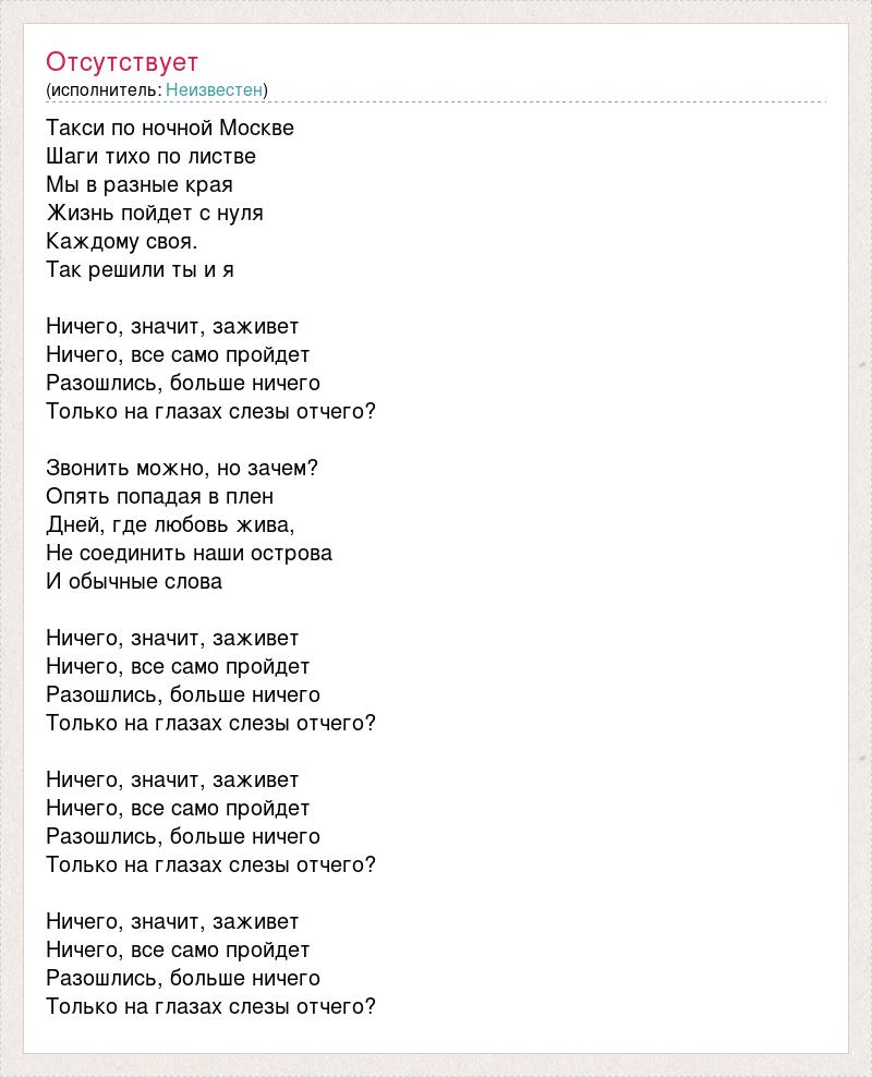 Такси по ночной Москве Шаги тихо по листве Мы в разные края Жизнь пойдет с нуля Каждому своя. Так решили ты и я Ничего, значит, заживет Ничего, все само пройдет Разошлись, больше ничего Только на глазах слезы отчего? Звонить можно, но зачем? Опять попадая в плен Дней, где любовь жива, Не соединить наши острова И обычные слова Ничего, значит, заживет Ничего, все само пройдет Разошлись, больше ничего Только на глазах слезы отчего? Ничего, значит, заживет Ничего, все само пройдет Разошлись, больше ничего Только на глазах слезы отчего? Ничего, значит, заживет Ничего, все само пройдет Разошлись, больше ничего Только на глазах слезы отчего?