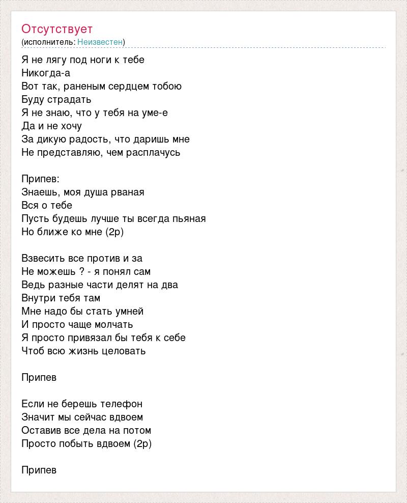 Я не лягу под ноги к тебе Никогда-а Вот так, раненым сердцем тобою Буду страдать Я не знаю, что у тебя на уме-е Да и не хочу За дикую радость, что даришь мне Не представляю, чем расплачусь Припев: Знаешь, моя душа рваная Вся о тебе Пусть будешь лучше ты всегда пьяная Но ближе ко мне (2р) Взвесить все против и за Не можешь ? - я понял сам Ведь разные части делят на два Внутри тебя там Мне надо бы стать умней И просто чаще молчать Я просто привязал бы тебя к себе Чтоб всю жизнь целовать Припев Если не берешь телефон Значит мы сейчас вдвоем Оставив все дела на потом Просто побыть вдвоем (2р) Припев