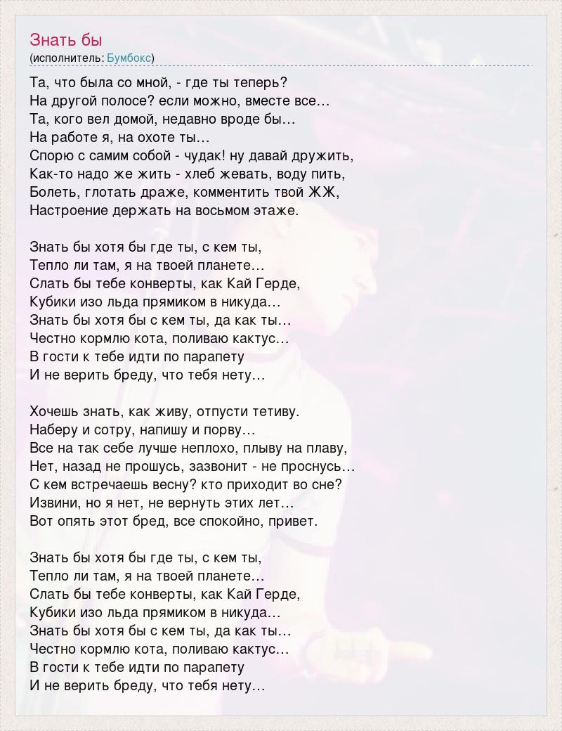 Та, что была со мной, - где ты теперь? На другой полосе? если можно, вместе все… Та, кого вел домой, недавно вроде бы… На работе я, на охоте ты… Спорю с самим собой - чудак! ну давай дружить, Как-то надо же жить - хлеб жевать, воду пить, Болеть, глотать драже, комментить твой ЖЖ, Настроение держать на восьмом этаже. Знать бы хотя бы где ты, с кем ты, Тепло ли там, я на твоей планете… Слать бы тебе конверты, как Кай Герде, Кубики изо льда прямиком в никуда… Знать бы хотя бы с кем ты, да как ты… Честно кормлю кота, поливаю кактус… В гости к тебе идти по парапету И не верить бреду, что тебя нету… Хочешь знать, как живу, отпусти тетиву. Наберу и сотру, напишу и порву… Все на так себе лучше неплохо, плыву на плаву, Нет, назад не прошусь, зазвонит - не проснусь… С кем встречаешь весну? кто приходит во сне? Извини, но я нет, не вернуть этих лет… Вот опять этот бред, все спокойно, привет. Знать бы хотя бы где ты, с кем ты, Тепло ли там, я на твоей планете… Слать бы тебе конверты, как Кай Герде, Кубики изо льда прямиком в никуда… Знать бы хотя бы с кем ты, да как ты… Честно кормлю кота, поливаю кактус… В гости к тебе идти по парапету И не верить бреду, что тебя нету…