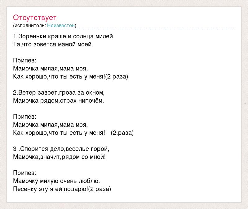1.Зореньки краше и солнца милей, Та,что зовётся мамой моей. Припев: Мамочка милая,мама моя, Как хорошо,что ты есть у меня!(2 раза) 2.Ветер завоет,гроза за окном, Мамочка рядом,страх нипочём. Припев: Мамочка милая,мама моя, Как хорошо,что ты есть у меня! (2.раза) 3 .Спорится дело,веселье горой, Мамочка,значит,рядом со мной! Припев: Мамочку милую очень люблю. Песенку эту я ей подарю!(2 раза)