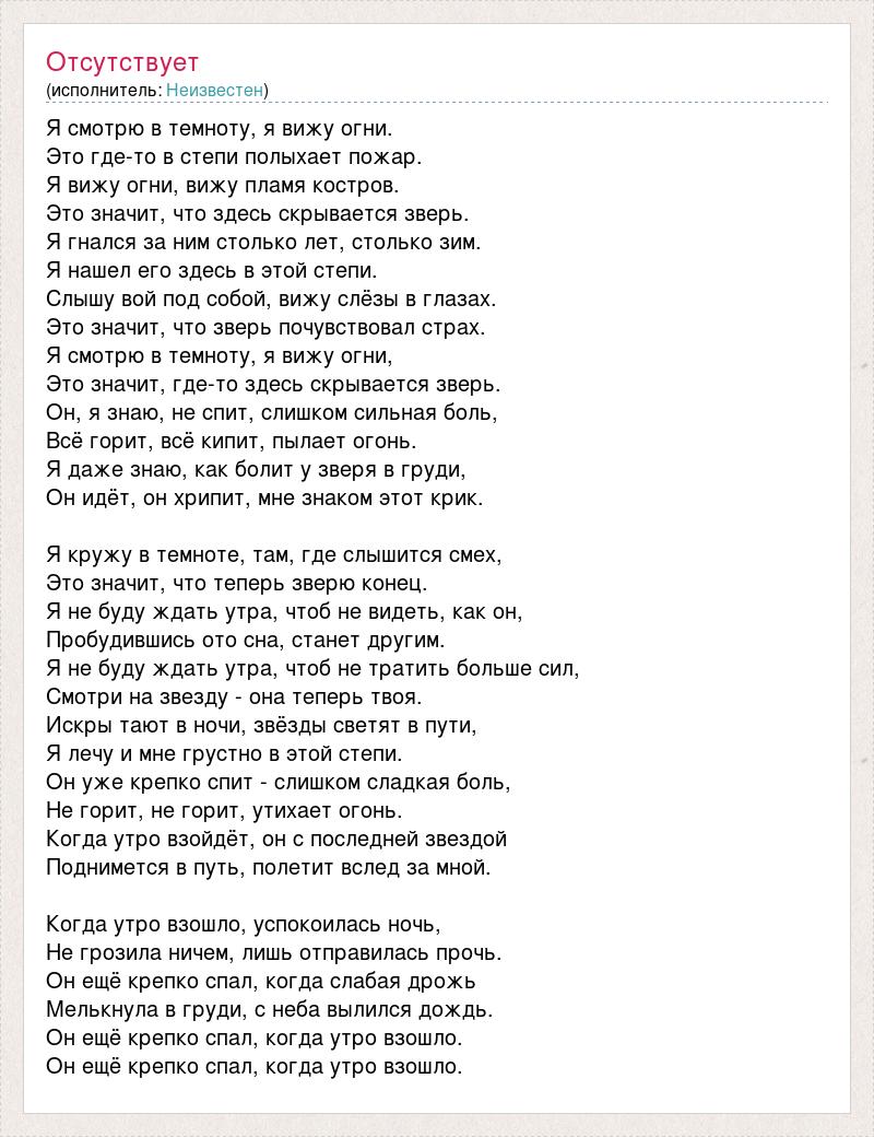Я смотрю в темноту, я вижу огни. Это где-то в степи полыхает пожар. Я вижу огни, вижу пламя костров. Это значит, что здесь скрывается зверь. Я гнался за ним столько лет, столько зим. Я нашел его здесь в этой степи. Слышу вой под собой, вижу слёзы в глазах. Это значит, что зверь почувствовал страх. Я смотрю в темноту, я вижу огни, Это значит, где-то здесь скрывается зверь. Он, я знаю, не спит, слишком сильная боль, Всё горит, всё кипит, пылает огонь. Я даже знаю, как болит у зверя в груди, Он идёт, он хрипит, мне знаком этот крик. Я кружу в темноте, там, где слышится смех, Это значит, что теперь зверю конец. Я не буду ждать утра, чтоб не видеть, как он, Пробудившись ото сна, станет другим. Я не буду ждать утра, чтоб не тратить больше сил, Смотри на звезду - она теперь твоя. Искры тают в ночи, звёзды светят в пути, Я лечу и мне грустно в этой степи. Он уже крепко спит - слишком сладкая боль, Не горит, не горит, утихает огонь. Когда утро взойдёт, он с последней звездой Поднимется в путь, полетит вслед за мной. Когда утро взошло, успокоилась ночь, Не грозила ничем, лишь отправилась прочь. Он ещё крепко спал, когда слабая дрожь Мелькнула в груди, с неба вылился дождь. Он ещё крепко спал, когда утро взошло. Он ещё крепко спал, когда утро взошло.